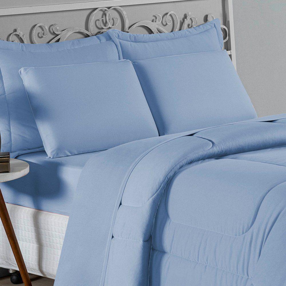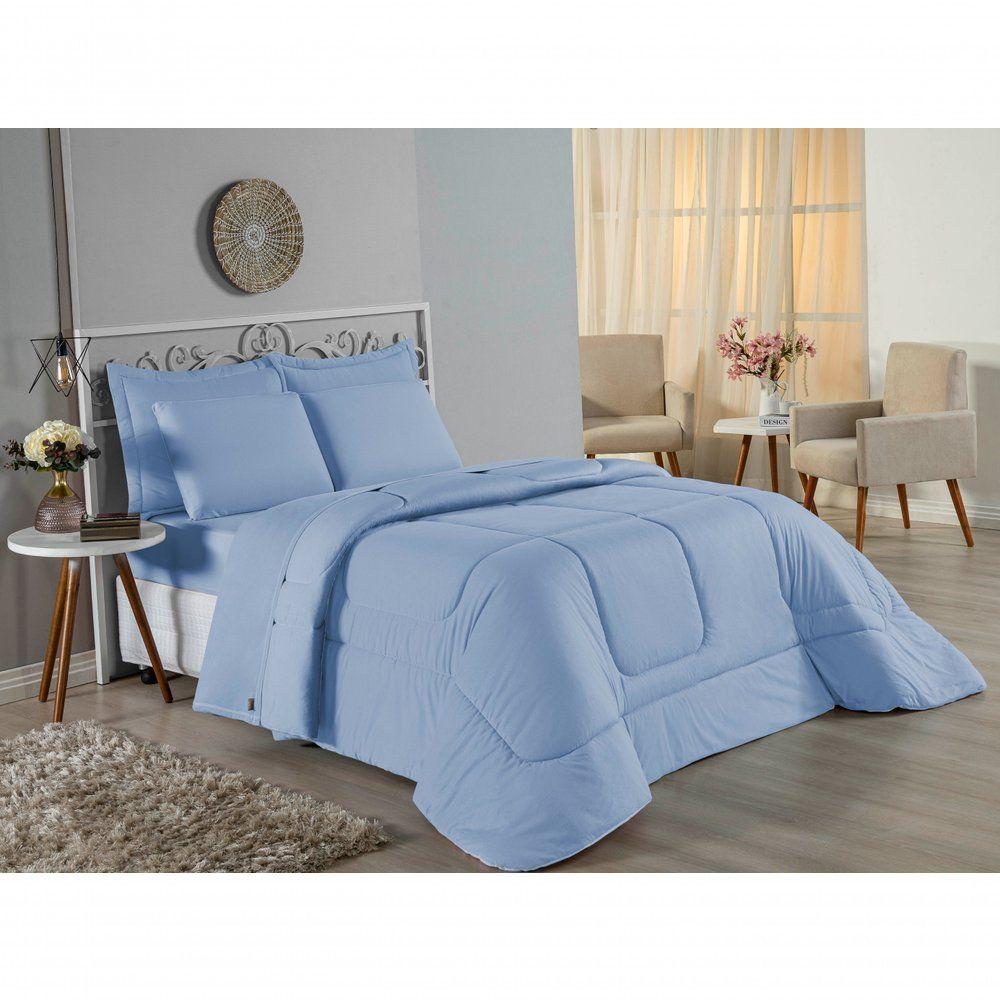 Kit Edredom Dupla Face + Jogo De Lençol Casal Nobre 6 Peças Malha 100% Algodão - Azul-bebêTransforme seu quarto em um ambiente de descanso luxuoso com o Kit Cama Completa Casal Nobre 6 Peças. A união perfeita entre a praticidade do dia a dia e o conforto superior da malha 100% algodão fio penteado.Por que este Kit é uma ótima escolha?- Toque Extremamente Macio: A confecção em Malha 100% Algodão Fio 30/1 Penteado proporciona uma sensação suave e natural, ideal para quem valoriza o conforto da pele.- Visual Sofisticado: O edredom dupla face e os dois porta travesseiros matelados conferem volume e elegância à cama, dispensando composições difíceis.- Durabilidade Superior: O fio penteado garante um tecido resistente, que mantém a aparência de novo e não forma bolinhas (anti-pilling).- Ajuste Perfeito: O lençol de baixo com elástico abraça colchões de até 30cm de altura, mantendo a cama sempre organizada.Produto composto por (Total 06 Peças):Do Kit Edredom (03 Peças):01 Edredom Casal Dupla Face: 2,00m x 2,20m02 Porta Travesseiros Matelados: 50cm x 70cmDo Jogo de Lençol (03 Peças):01 Lençol de Baixo com Elástico: 1,38m x 1,98m x 30cm02 Fronhas: 70cm x 50cmAtenção: Este kit é composto pelo jogo de cama essencial (lençol com elástico e fronhas) e não inclui o lençol de cima (sobre lençol).Composição:Tecido (Todas as peças): Malha 100% Algodão - Fio 30/1 PenteadoEnchimento (Edredom e Porta Travesseiros): 100% Poliéster (Edredom com fibra siliconada)Forro (Apenas Porta Travesseiros): 100% Polipropileno