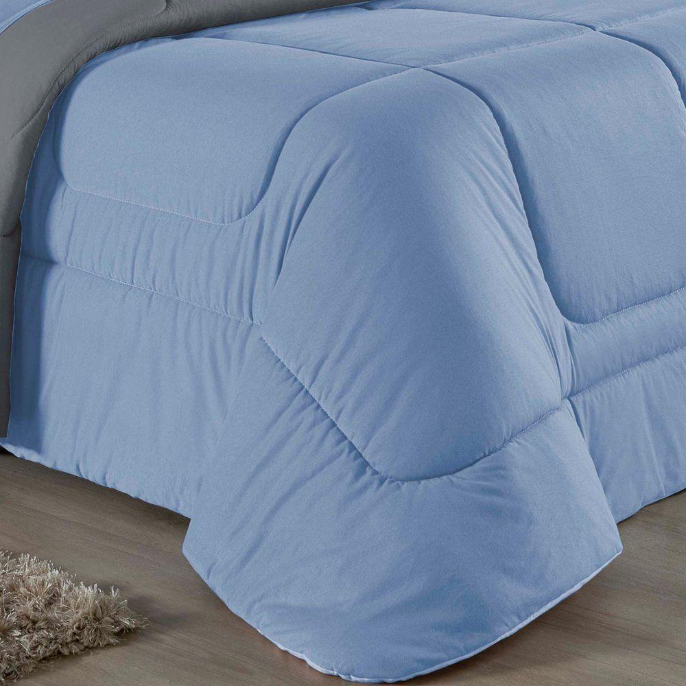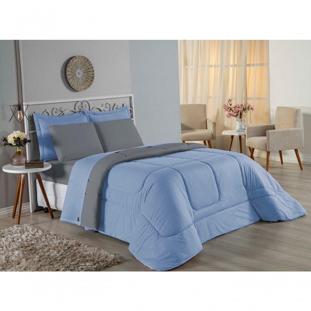 Kit Edredom Dupla Face + Jogo De Lençol Casal Nobre 6 Peças Malha 100% Algodão - Azul-bebê / CinzaTransforme seu quarto em um ambiente de descanso luxuoso com o Kit Cama Completa Casal Nobre 6 Peças. A união perfeita entre a praticidade do dia a dia e o conforto superior da malha 100% algodão fio penteado.Por que este Kit é uma ótima escolha?- Toque Extremamente Macio: A confecção em Malha 100% Algodão Fio 30/1 Penteado proporciona uma sensação suave e natural, ideal para quem valoriza o conforto da pele.- Visual Sofisticado: O edredom dupla face e os dois porta travesseiros matelados conferem volume e elegância à cama, dispensando composições difíceis.- Durabilidade Superior: O fio penteado garante um tecido resistente, que mantém a aparência de novo e não forma bolinhas (anti-pilling).- Ajuste Perfeito: O lençol de baixo com elástico abraça colchões de até 30cm de altura, mantendo a cama sempre organizada.Produto composto por (Total 06 Peças):Do Kit Edredom (03 Peças):01 Edredom Casal Dupla Face: 2,00m x 2,20m02 Porta Travesseiros Matelados: 50cm x 70cmDo Jogo de Lençol (03 Peças):01 Lençol de Baixo com Elástico: 1,38m x 1,98m x 30cm02 Fronhas: 70cm x 50cmAtenção: Este kit é composto pelo jogo de cama essencial (lençol com elástico e fronhas) e não inclui o lençol de cima (sobre lençol).Composição:Tecido (Todas as peças): Malha 100% Algodão - Fio 30/1 PenteadoEnchimento (Edredom e Porta Travesseiros): 100% Poliéster (Edredom com fibra siliconada)Forro (Apenas Porta Travesseiros): 100% Polipropileno