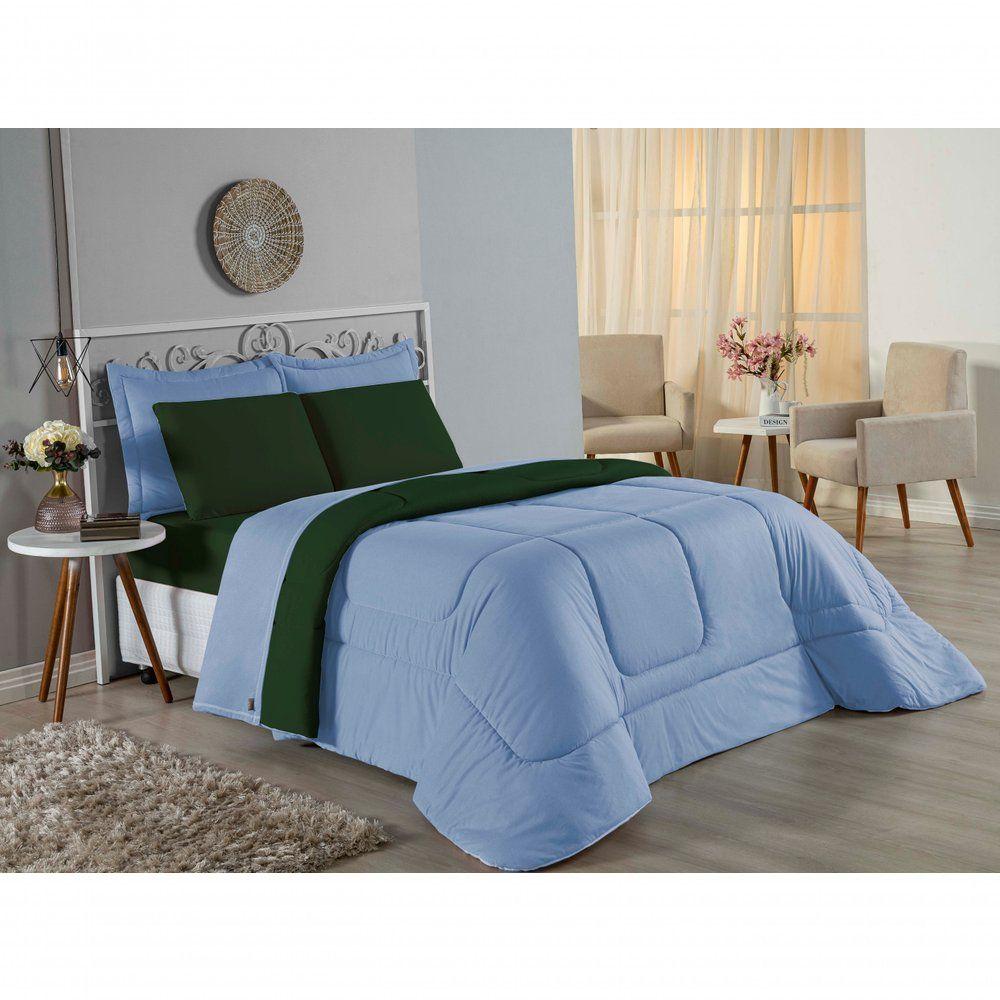 Kit Edredom Dupla Face + Jogo De Lençol Casal Nobre 6 Peças Malha 100% Algodão - Azul-bebê / Verde-bandeiraTransforme seu quarto em um ambiente de descanso luxuoso com o Kit Cama Completa Casal Nobre 6 Peças. A união perfeita entre a praticidade do dia a dia e o conforto superior da malha 100% algodão fio penteado.Por que este Kit é uma ótima escolha?- Toque Extremamente Macio: A confecção em Malha 100% Algodão Fio 30/1 Penteado proporciona uma sensação suave e natural, ideal para quem valoriza o conforto da pele.- Visual Sofisticado: O edredom dupla face e os dois porta travesseiros matelados conferem volume e elegância à cama, dispensando composições difíceis.- Durabilidade Superior: O fio penteado garante um tecido resistente, que mantém a aparência de novo e não forma bolinhas (anti-pilling).- Ajuste Perfeito: O lençol de baixo com elástico abraça colchões de até 30cm de altura, mantendo a cama sempre organizada.Produto composto por (Total 06 Peças):Do Kit Edredom (03 Peças):01 Edredom Casal Dupla Face: 2,00m x 2,20m02 Porta Travesseiros Matelados: 50cm x 70cmDo Jogo de Lençol (03 Peças):01 Lençol de Baixo com Elástico: 1,38m x 1,98m x 30cm02 Fronhas: 70cm x 50cmAtenção: Este kit é composto pelo jogo de cama essencial (lençol com elástico e fronhas) e não inclui o lençol de cima (sobre lençol).Composição:Tecido (Todas as peças): Malha 100% Algodão - Fio 30/1 PenteadoEnchimento (Edredom e Porta Travesseiros): 100% Poliéster (Edredom com fibra siliconada)Forro (Apenas Porta Travesseiros): 100% Polipropileno
