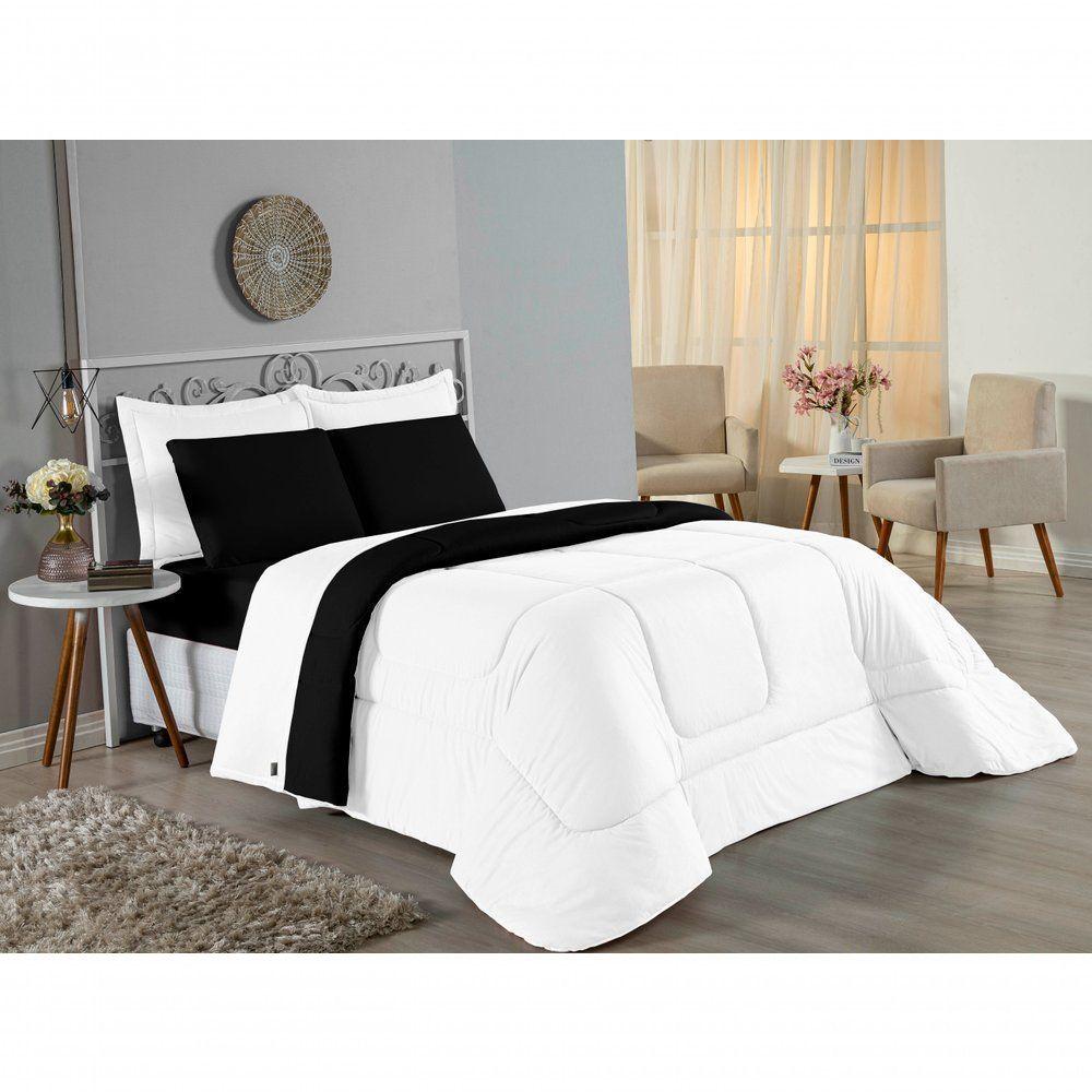 Kit Edredom Dupla Face + Jogo De Lençol Casal Nobre 6 Peças Malha 100% Algodão - Branco / PretoTransforme seu quarto em um ambiente de descanso luxuoso com o Kit Cama Completa Casal Nobre 6 Peças. A união perfeita entre a praticidade do dia a dia e o conforto superior da malha 100% algodão fio penteado.Por que este Kit é uma ótima escolha?- Toque Extremamente Macio: A confecção em Malha 100% Algodão Fio 30/1 Penteado proporciona uma sensação suave e natural, ideal para quem valoriza o conforto da pele.- Visual Sofisticado: O edredom dupla face e os dois porta travesseiros matelados conferem volume e elegância à cama, dispensando composições difíceis.- Durabilidade Superior: O fio penteado garante um tecido resistente, que mantém a aparência de novo e não forma bolinhas (anti-pilling).- Ajuste Perfeito: O lençol de baixo com elástico abraça colchões de até 30cm de altura, mantendo a cama sempre organizada.Produto composto por (Total 06 Peças):Do Kit Edredom (03 Peças):01 Edredom Casal Dupla Face: 2,00m x 2,20m02 Porta Travesseiros Matelados: 50cm x 70cmDo Jogo de Lençol (03 Peças):01 Lençol de Baixo com Elástico: 1,38m x 1,98m x 30cm02 Fronhas: 70cm x 50cmAtenção: Este kit é composto pelo jogo de cama essencial (lençol com elástico e fronhas) e não inclui o lençol de cima (sobre lençol).Composição:Tecido (Todas as peças): Malha 100% Algodão - Fio 30/1 PenteadoEnchimento (Edredom e Porta Travesseiros): 100% Poliéster (Edredom com fibra siliconada)Forro (Apenas Porta Travesseiros): 100% Polipropileno