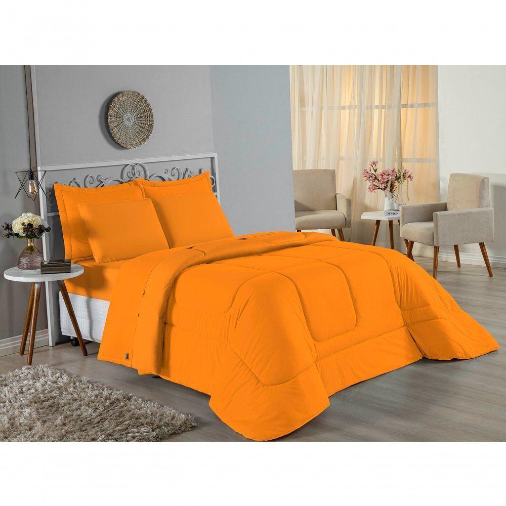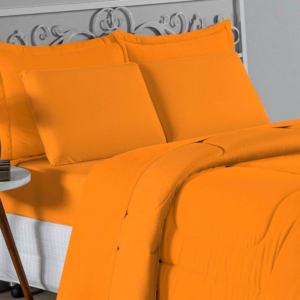 Kit Edredom Dupla Face + Jogo De Lençol Casal Nobre 6 Peças Malha 100% Algodão - LaranjaTransforme seu quarto em um ambiente de descanso luxuoso com o Kit Cama Completa Casal Nobre 6 Peças. A união perfeita entre a praticidade do dia a dia e o conforto superior da malha 100% algodão fio penteado.Por que este Kit é uma ótima escolha?- Toque Extremamente Macio: A confecção em Malha 100% Algodão Fio 30/1 Penteado proporciona uma sensação suave e natural, ideal para quem valoriza o conforto da pele.- Visual Sofisticado: O edredom dupla face e os dois porta travesseiros matelados conferem volume e elegância à cama, dispensando composições difíceis.- Durabilidade Superior: O fio penteado garante um tecido resistente, que mantém a aparência de novo e não forma bolinhas (anti-pilling).- Ajuste Perfeito: O lençol de baixo com elástico abraça colchões de até 30cm de altura, mantendo a cama sempre organizada.Produto composto por (Total 06 Peças):Do Kit Edredom (03 Peças):01 Edredom Casal Dupla Face: 2,00m x 2,20m02 Porta Travesseiros Matelados: 50cm x 70cmDo Jogo de Lençol (03 Peças):01 Lençol de Baixo com Elástico: 1,38m x 1,98m x 30cm02 Fronhas: 70cm x 50cmAtenção: Este kit é composto pelo jogo de cama essencial (lençol com elástico e fronhas) e não inclui o lençol de cima (sobre lençol).Composição:Tecido (Todas as peças): Malha 100% Algodão - Fio 30/1 PenteadoEnchimento (Edredom e Porta Travesseiros): 100% Poliéster (Edredom com fibra siliconada)Forro (Apenas Porta Travesseiros): 100% Polipropileno