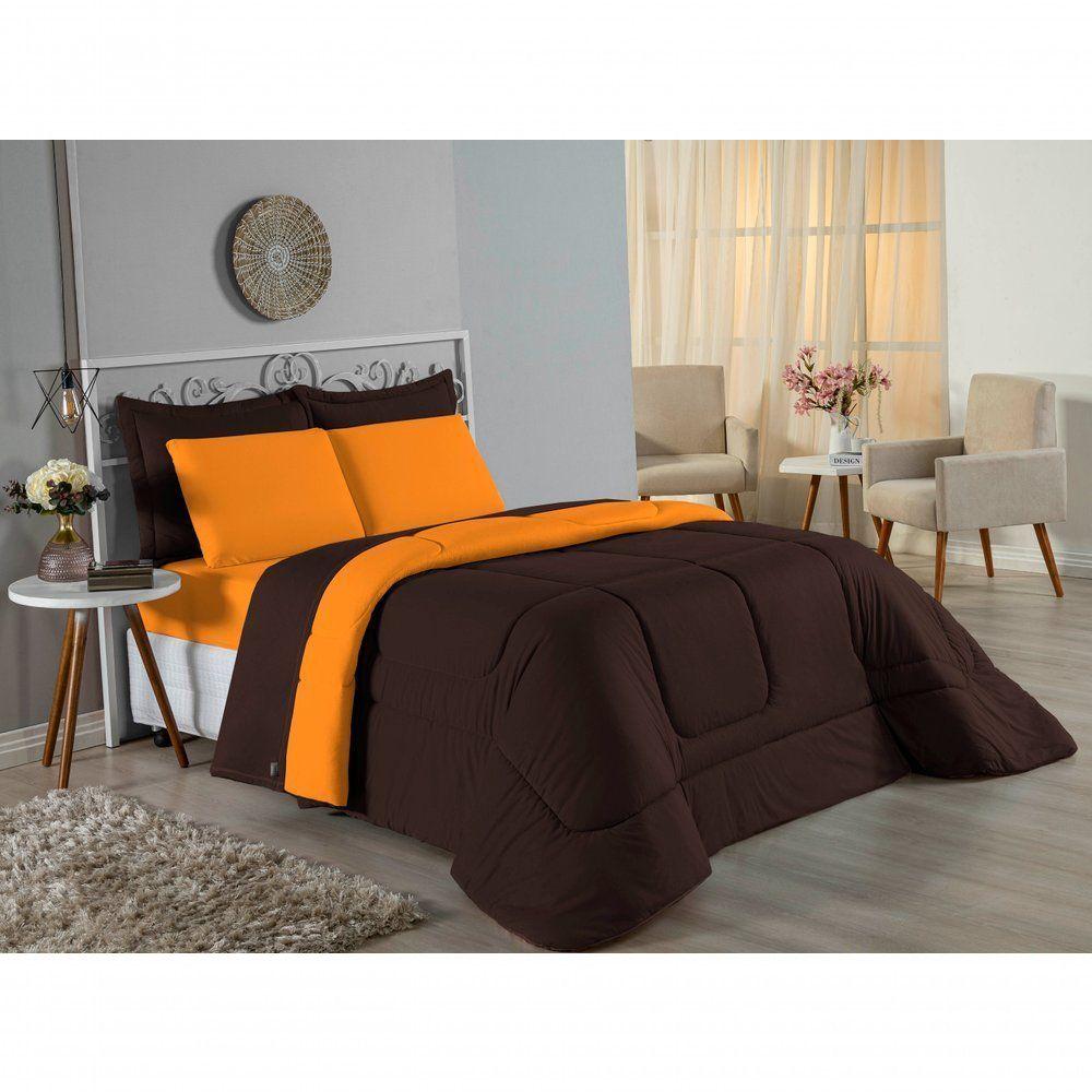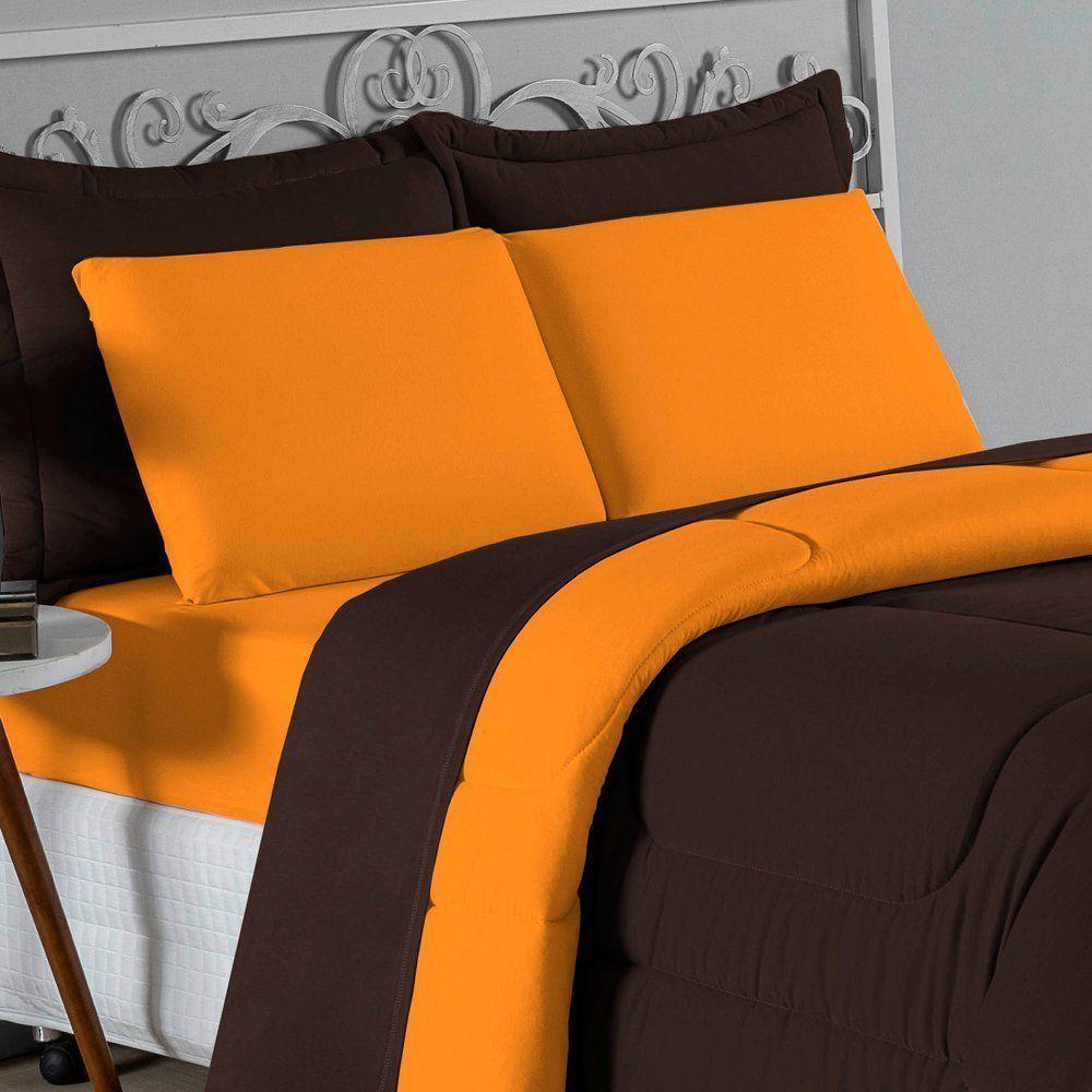 Kit Edredom Dupla Face + Jogo De Lençol Casal Nobre 6 Peças Malha 100% Algodão - Marrom / Laranja