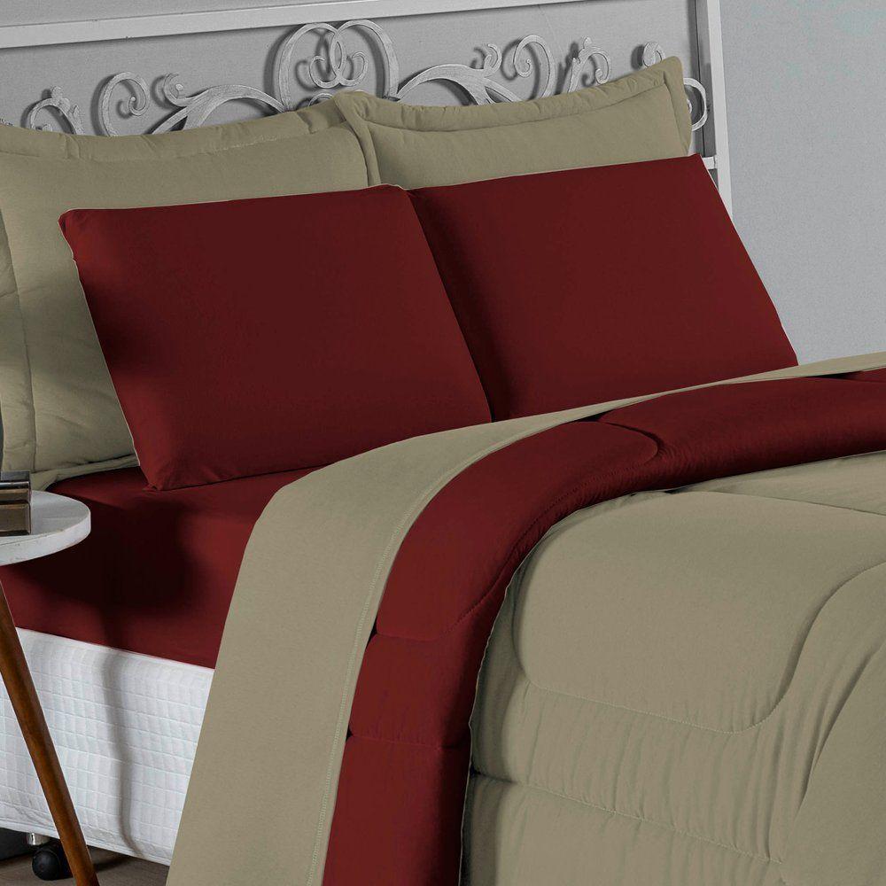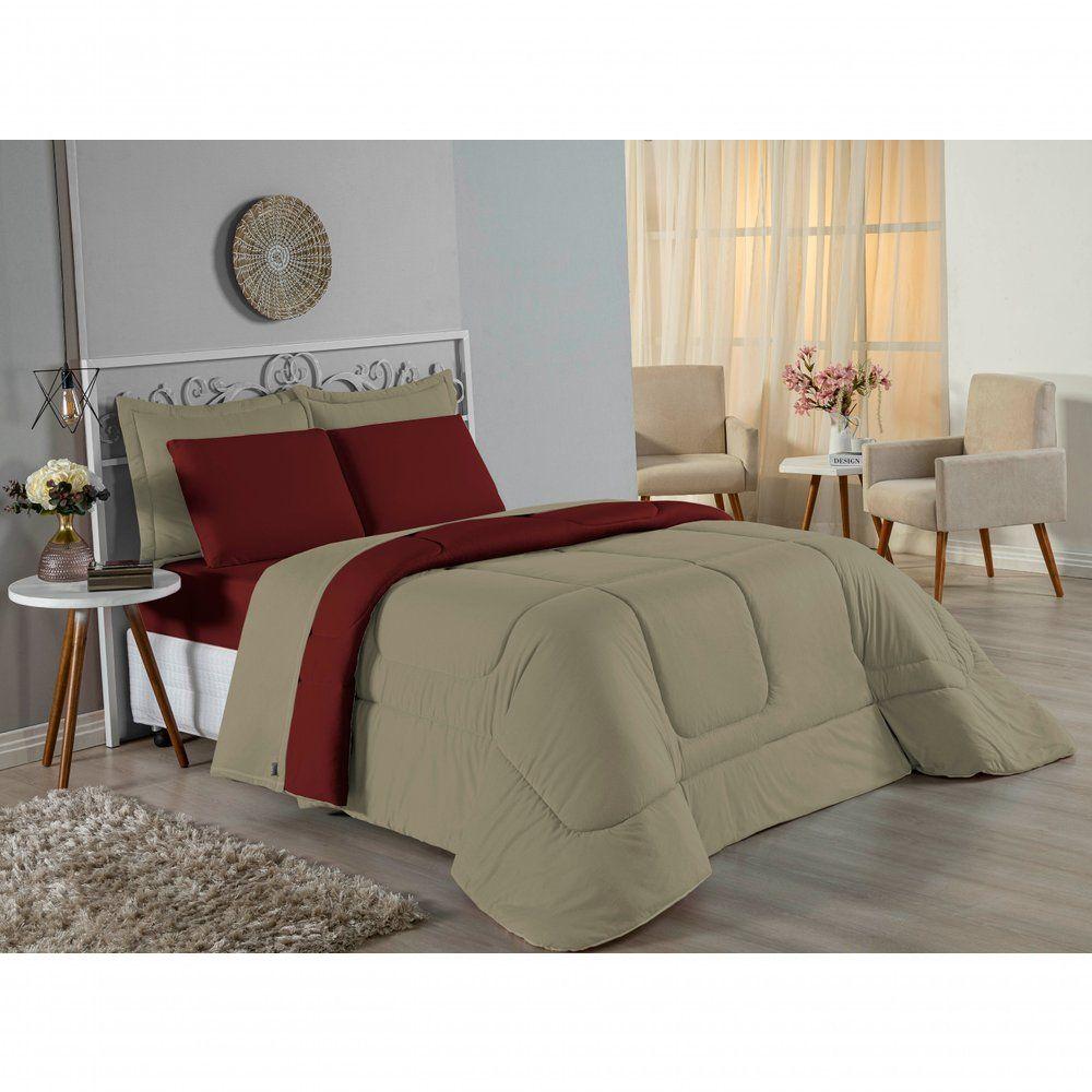 Kit Edredom Dupla Face + Jogo De Lençol Casal Nobre 6 Peças Malha 100% Algodão - Avelã / VinhoTransforme seu quarto em um ambiente de descanso luxuoso com o Kit Cama Completa Casal Nobre 6 Peças. A união perfeita entre a praticidade do dia a dia e o conforto superior da malha 100% algodão fio penteado.Por que este Kit é uma ótima escolha?- Toque Extremamente Macio: A confecção em Malha 100% Algodão Fio 30/1 Penteado proporciona uma sensação suave e natural, ideal para quem valoriza o conforto da pele.- Visual Sofisticado: O edredom dupla face e os dois porta travesseiros matelados conferem volume e elegância à cama, dispensando composições difíceis.- Durabilidade Superior: O fio penteado garante um tecido resistente, que mantém a aparência de novo e não forma bolinhas (anti-pilling).- Ajuste Perfeito: O lençol de baixo com elástico abraça colchões de até 30cm de altura, mantendo a cama sempre organizada.Produto composto por (Total 06 Peças):Do Kit Edredom (03 Peças):01 Edredom Casal Dupla Face: 2,00m x 2,20m02 Porta Travesseiros Matelados: 50cm x 70cmDo Jogo de Lençol (03 Peças):01 Lençol de Baixo com Elástico: 1,38m x 1,98m x 30cm02 Fronhas: 70cm x 50cmAtenção: Este kit é composto pelo jogo de cama essencial (lençol com elástico e fronhas) e não inclui o lençol de cima (sobre lençol).Composição:Tecido (Todas as peças): Malha 100% Algodão - Fio 30/1 PenteadoEnchimento (Edredom e Porta Travesseiros): 100% Poliéster (Edredom com fibra siliconada)Forro (Apenas Porta Travesseiros): 100% Polipropileno