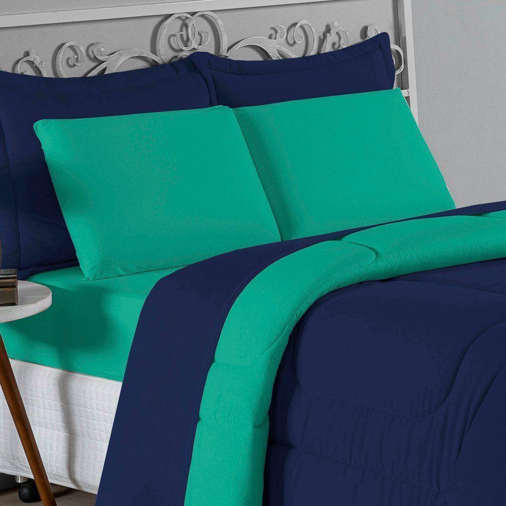 Kit Edredom Dupla Face + Jogo De Lençol Casal Nobre 6 Peças Malha 100% Algodão - Azul-marinho / JadeTransforme seu quarto em um ambiente de descanso luxuoso com o Kit Cama Completa Casal Nobre 6 Peças. A união perfeita entre a praticidade do dia a dia e o conforto superior da malha 100% algodão fio penteado.Por que este Kit é uma ótima escolha?- Toque Extremamente Macio: A confecção em Malha 100% Algodão Fio 30/1 Penteado proporciona uma sensação suave e natural, ideal para quem valoriza o conforto da pele.- Visual Sofisticado: O edredom dupla face e os dois porta travesseiros matelados conferem volume e elegância à cama, dispensando composições difíceis.- Durabilidade Superior: O fio penteado garante um tecido resistente, que mantém a aparência de novo e não forma bolinhas (anti-pilling).- Ajuste Perfeito: O lençol de baixo com elástico abraça colchões de até 30cm de altura, mantendo a cama sempre organizada.Produto composto por (Total 06 Peças):Do Kit Edredom (03 Peças):01 Edredom Casal Dupla Face: 2,00m x 2,20m02 Porta Travesseiros Matelados: 50cm x 70cmDo Jogo de Lençol (03 Peças):01 Lençol de Baixo com Elástico: 1,38m x 1,98m x 30cm02 Fronhas: 70cm x 50cmAtenção: Este kit é composto pelo jogo de cama essencial (lençol com elástico e fronhas) e não inclui o lençol de cima (sobre lençol).Composição:Tecido (Todas as peças): Malha 100% Algodão - Fio 30/1 PenteadoEnchimento (Edredom e Porta Travesseiros): 100% Poliéster (Edredom com fibra siliconada)Forro (Apenas Porta Travesseiros): 100% Polipropileno