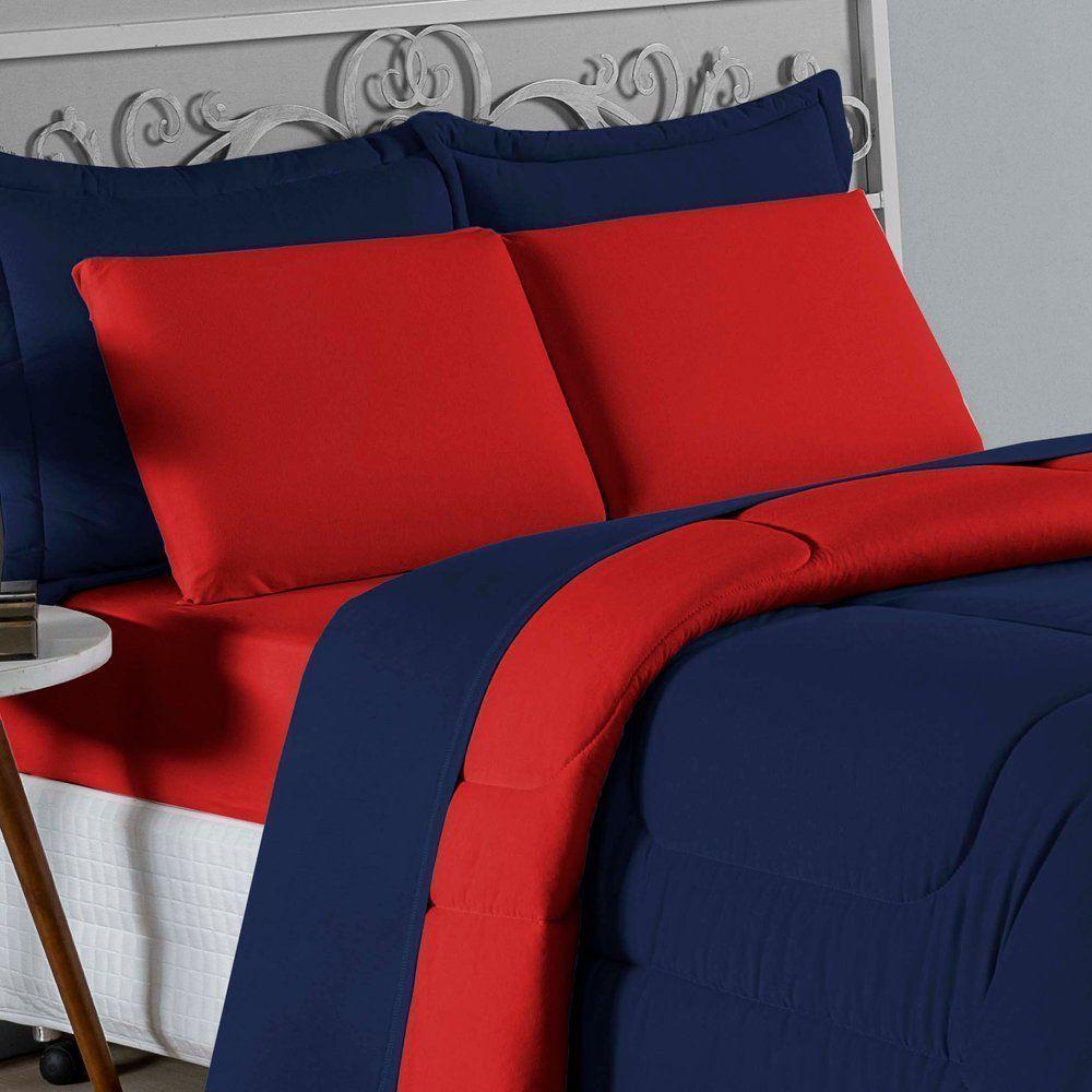 Kit Edredom Dupla Face + Jogo De Lençol Casal Nobre 6 Peças Malha 100% Algodão - Azul-marinho / VermelhoTransforme seu quarto em um ambiente de descanso luxuoso com o Kit Cama Completa Casal Nobre 6 Peças. A união perfeita entre a praticidade do dia a dia e o conforto superior da malha 100% algodão fio penteado.Por que este Kit é uma ótima escolha?- Toque Extremamente Macio: A confecção em Malha 100% Algodão Fio 30/1 Penteado proporciona uma sensação suave e natural, ideal para quem valoriza o conforto da pele.- Visual Sofisticado: O edredom dupla face e os dois porta travesseiros matelados conferem volume e elegância à cama, dispensando composições difíceis.- Durabilidade Superior: O fio penteado garante um tecido resistente, que mantém a aparência de novo e não forma bolinhas (anti-pilling).- Ajuste Perfeito: O lençol de baixo com elástico abraça colchões de até 30cm de altura, mantendo a cama sempre organizada.Produto composto por (Total 06 Peças):Do Kit Edredom (03 Peças):01 Edredom Casal Dupla Face: 2,00m x 2,20m02 Porta Travesseiros Matelados: 50cm x 70cmDo Jogo de Lençol (03 Peças):01 Lençol de Baixo com Elástico: 1,38m x 1,98m x 30cm02 Fronhas: 70cm x 50cmAtenção: Este kit é composto pelo jogo de cama essencial (lençol com elástico e fronhas) e não inclui o lençol de cima (sobre lençol).Composição:Tecido (Todas as peças): Malha 100% Algodão - Fio 30/1 PenteadoEnchimento (Edredom e Porta Travesseiros): 100% Poliéster (Edredom com fibra siliconada)Forro (Apenas Porta Travesseiros): 100% Polipropileno