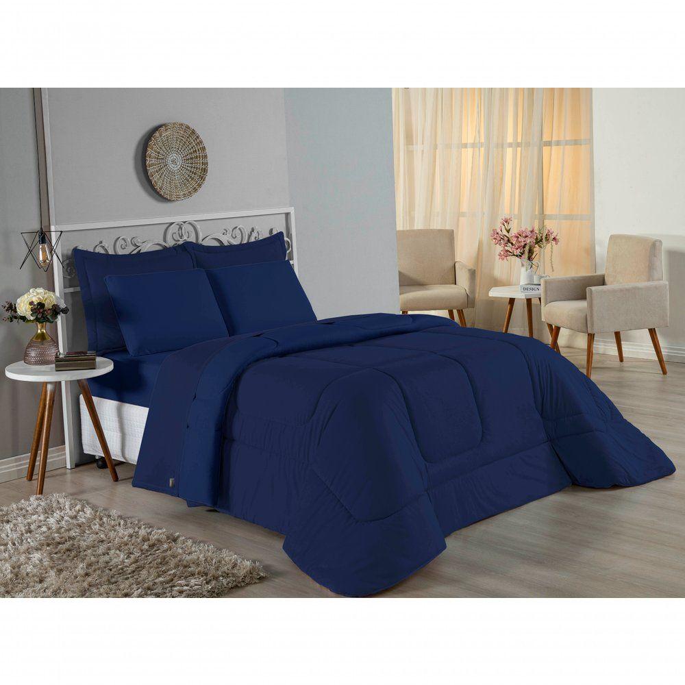 Kit Edredom Dupla Face + Jogo De Lençol Casal Nobre 6 Peças Malha 100% Algodão - Azul-marinhoTransforme seu quarto em um ambiente de descanso luxuoso com o Kit Cama Completa Casal Nobre 6 Peças. A união perfeita entre a praticidade do dia a dia e o conforto superior da malha 100% algodão fio penteado.Por que este Kit é uma ótima escolha?- Toque Extremamente Macio: A confecção em Malha 100% Algodão Fio 30/1 Penteado proporciona uma sensação suave e natural, ideal para quem valoriza o conforto da pele.- Visual Sofisticado: O edredom dupla face e os dois porta travesseiros matelados conferem volume e elegância à cama, dispensando composições difíceis.- Durabilidade Superior: O fio penteado garante um tecido resistente, que mantém a aparência de novo e não forma bolinhas (anti-pilling).- Ajuste Perfeito: O lençol de baixo com elástico abraça colchões de até 30cm de altura, mantendo a cama sempre organizada.Produto composto por (Total 06 Peças):Do Kit Edredom (03 Peças):01 Edredom Casal Dupla Face: 2,00m x 2,20m02 Porta Travesseiros Matelados: 50cm x 70cmDo Jogo de Lençol (03 Peças):01 Lençol de Baixo com Elástico: 1,38m x 1,98m x 30cm02 Fronhas: 70cm x 50cmAtenção: Este kit é composto pelo jogo de cama essencial (lençol com elástico e fronhas) e não inclui o lençol de cima (sobre lençol).Composição:Tecido (Todas as peças): Malha 100% Algodão - Fio 30/1 PenteadoEnchimento (Edredom e Porta Travesseiros): 100% Poliéster (Edredom com fibra siliconada)Forro (Apenas Porta Travesseiros): 100% Polipropileno