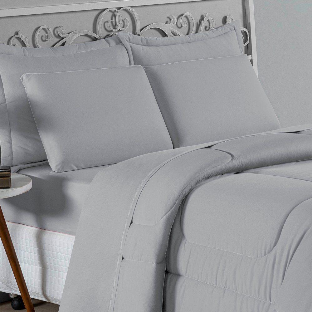 Kit Edredom Dupla Face + Jogo De Lençol Casal Nobre 6 Peças Malha 100% Algodão - CinzaTransforme seu quarto em um ambiente de descanso luxuoso com o Kit Cama Completa Casal Nobre 6 Peças. A união perfeita entre a praticidade do dia a dia e o conforto superior da malha 100% algodão fio penteado.Por que este Kit é uma ótima escolha?- Toque Extremamente Macio: A confecção em Malha 100% Algodão Fio 30/1 Penteado proporciona uma sensação suave e natural, ideal para quem valoriza o conforto da pele.- Visual Sofisticado: O edredom dupla face e os dois porta travesseiros matelados conferem volume e elegância à cama, dispensando composições difíceis.- Durabilidade Superior: O fio penteado garante um tecido resistente, que mantém a aparência de novo e não forma bolinhas (anti-pilling).- Ajuste Perfeito: O lençol de baixo com elástico abraça colchões de até 30cm de altura, mantendo a cama sempre organizada.Produto composto por (Total 06 Peças):Do Kit Edredom (03 Peças):01 Edredom Casal Dupla Face: 2,00m x 2,20m02 Porta Travesseiros Matelados: 50cm x 70cmDo Jogo de Lençol (03 Peças):01 Lençol de Baixo com Elástico: 1,38m x 1,98m x 30cm02 Fronhas: 70cm x 50cmAtenção: Este kit é composto pelo jogo de cama essencial (lençol com elástico e fronhas) e não inclui o lençol de cima (sobre lençol).Composição:Tecido (Todas as peças): Malha 100% Algodão - Fio 30/1 PenteadoEnchimento (Edredom e Porta Travesseiros): 100% Poliéster (Edredom com fibra siliconada)Forro (Apenas Porta Travesseiros): 100% Polipropileno