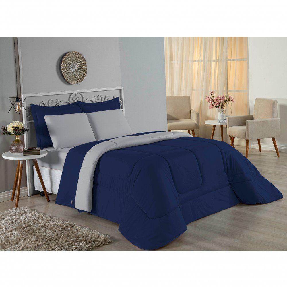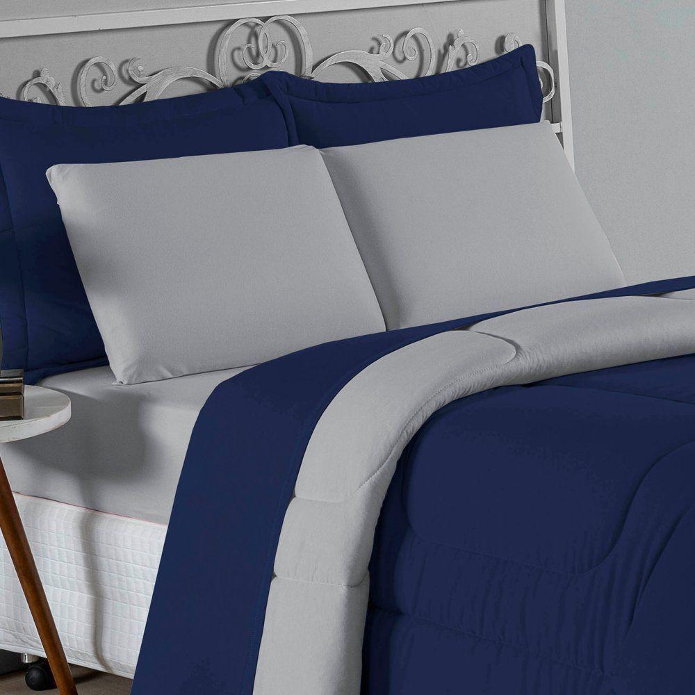 Kit Edredom Dupla Face + Jogo De Lençol Casal Nobre 6 Peças Malha 100% Algodão - Azul-marinho / CinzaTransforme seu quarto em um ambiente de descanso luxuoso com o Kit Cama Completa Casal Nobre 6 Peças. A união perfeita entre a praticidade do dia a dia e o conforto superior da malha 100% algodão fio penteado.Por que este Kit é uma ótima escolha?- Toque Extremamente Macio: A confecção em Malha 100% Algodão Fio 30/1 Penteado proporciona uma sensação suave e natural, ideal para quem valoriza o conforto da pele.- Visual Sofisticado: O edredom dupla face e os dois porta travesseiros matelados conferem volume e elegância à cama, dispensando composições difíceis.- Durabilidade Superior: O fio penteado garante um tecido resistente, que mantém a aparência de novo e não forma bolinhas (anti-pilling).- Ajuste Perfeito: O lençol de baixo com elástico abraça colchões de até 30cm de altura, mantendo a cama sempre organizada.Produto composto por (Total 06 Peças):Do Kit Edredom (03 Peças):01 Edredom Casal Dupla Face: 2,00m x 2,20m02 Porta Travesseiros Matelados: 50cm x 70cmDo Jogo de Lençol (03 Peças):01 Lençol de Baixo com Elástico: 1,38m x 1,98m x 30cm02 Fronhas: 70cm x 50cmAtenção: Este kit é composto pelo jogo de cama essencial (lençol com elástico e fronhas) e não inclui o lençol de cima (sobre lençol).Composição:Tecido (Todas as peças): Malha 100% Algodão - Fio 30/1 PenteadoEnchimento (Edredom e Porta Travesseiros): 100% Poliéster (Edredom com fibra siliconada)Forro (Apenas Porta Travesseiros): 100% Polipropileno