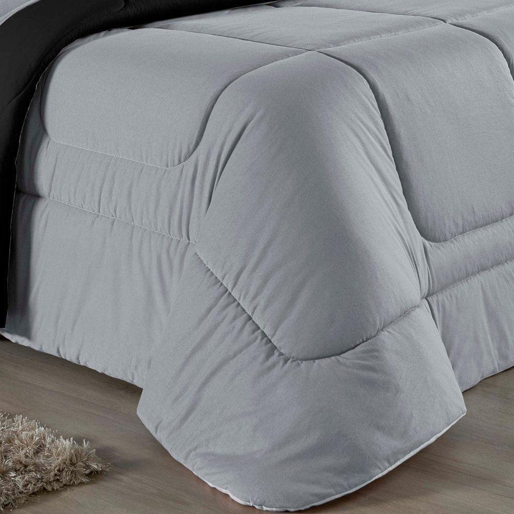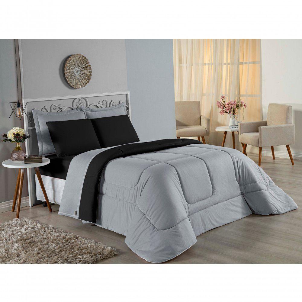 Kit Edredom Dupla Face + Jogo De Lençol Casal Nobre 6 Peças Malha 100% Algodão - Cinza / PretoTransforme seu quarto em um ambiente de descanso luxuoso com o Kit Cama Completa Casal Nobre 6 Peças. A união perfeita entre a praticidade do dia a dia e o conforto superior da malha 100% algodão fio penteado.Por que este Kit é uma ótima escolha?- Toque Extremamente Macio: A confecção em Malha 100% Algodão Fio 30/1 Penteado proporciona uma sensação suave e natural, ideal para quem valoriza o conforto da pele.- Visual Sofisticado: O edredom dupla face e os dois porta travesseiros matelados conferem volume e elegância à cama, dispensando composições difíceis.- Durabilidade Superior: O fio penteado garante um tecido resistente, que mantém a aparência de novo e não forma bolinhas (anti-pilling).- Ajuste Perfeito: O lençol de baixo com elástico abraça colchões de até 30cm de altura, mantendo a cama sempre organizada.Produto composto por (Total 06 Peças):Do Kit Edredom (03 Peças):01 Edredom Casal Dupla Face: 2,00m x 2,20m02 Porta Travesseiros Matelados: 50cm x 70cmDo Jogo de Lençol (03 Peças):01 Lençol de Baixo com Elástico: 1,38m x 1,98m x 30cm02 Fronhas: 70cm x 50cmAtenção: Este kit é composto pelo jogo de cama essencial (lençol com elástico e fronhas) e não inclui o lençol de cima (sobre lençol).Composição:Tecido (Todas as peças): Malha 100% Algodão - Fio 30/1 PenteadoEnchimento (Edredom e Porta Travesseiros): 100% Poliéster (Edredom com fibra siliconada)Forro (Apenas Porta Travesseiros): 100% Polipropileno