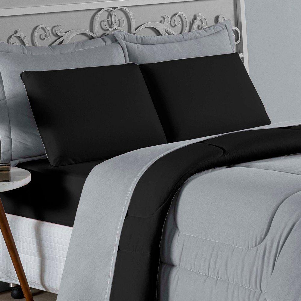 Kit Edredom Dupla Face + Jogo De Lençol Casal Nobre 6 Peças Malha 100% Algodão - Cinza / Preto