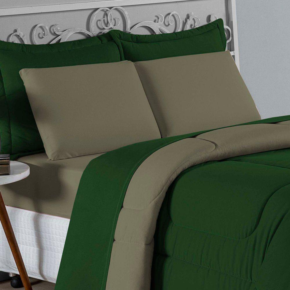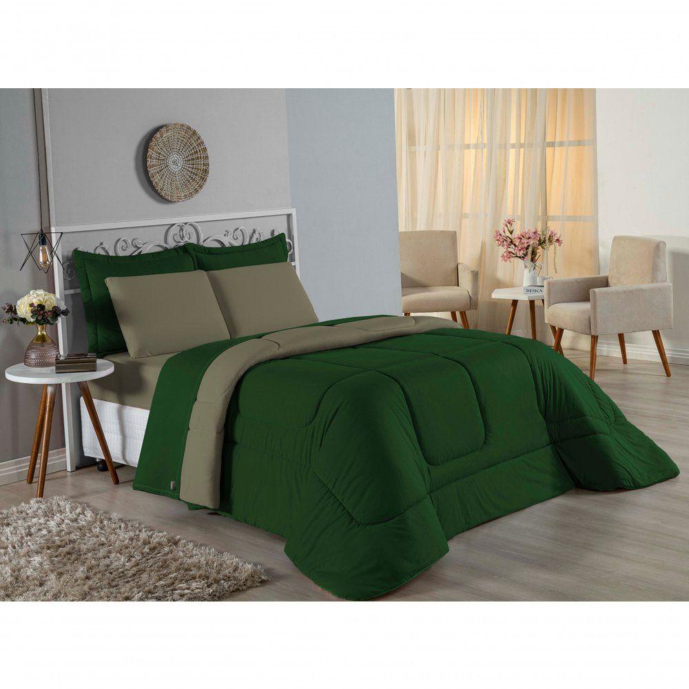 Kit Edredom Dupla Face + Jogo De Lençol Casal Nobre 6 Peças Malha 100% Algodão - Verde-bandeira / AvelãTransforme seu quarto em um ambiente de descanso luxuoso com o Kit Cama Completa Casal Nobre 6 Peças. A união perfeita entre a praticidade do dia a dia e o conforto superior da malha 100% algodão fio penteado.Por que este Kit é uma ótima escolha?- Toque Extremamente Macio: A confecção em Malha 100% Algodão Fio 30/1 Penteado proporciona uma sensação suave e natural, ideal para quem valoriza o conforto da pele.- Visual Sofisticado: O edredom dupla face e os dois porta travesseiros matelados conferem volume e elegância à cama, dispensando composições difíceis.- Durabilidade Superior: O fio penteado garante um tecido resistente, que mantém a aparência de novo e não forma bolinhas (anti-pilling).- Ajuste Perfeito: O lençol de baixo com elástico abraça colchões de até 30cm de altura, mantendo a cama sempre organizada.Produto composto por (Total 06 Peças):Do Kit Edredom (03 Peças):01 Edredom Casal Dupla Face: 2,00m x 2,20m02 Porta Travesseiros Matelados: 50cm x 70cmDo Jogo de Lençol (03 Peças):01 Lençol de Baixo com Elástico: 1,38m x 1,98m x 30cm02 Fronhas: 70cm x 50cmAtenção: Este kit é composto pelo jogo de cama essencial (lençol com elástico e fronhas) e não inclui o lençol de cima (sobre lençol).Composição:Tecido (Todas as peças): Malha 100% Algodão - Fio 30/1 PenteadoEnchimento (Edredom e Porta Travesseiros): 100% Poliéster (Edredom com fibra siliconada)Forro (Apenas Porta Travesseiros): 100% Polipropileno