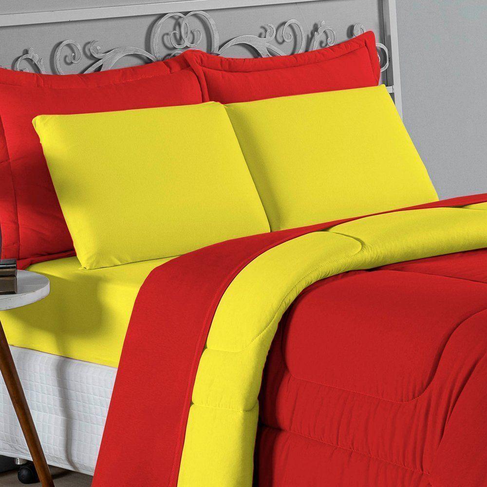 Kit Edredom Dupla Face + Jogo De Lençol Casal Nobre 6 Peças Malha 100% Algodão - Vermelho / AmareloTransforme seu quarto em um ambiente de descanso luxuoso com o Kit Cama Completa Casal Nobre 6 Peças. A união perfeita entre a praticidade do dia a dia e o conforto superior da malha 100% algodão fio penteado.Por que este Kit é uma ótima escolha?- Toque Extremamente Macio: A confecção em Malha 100% Algodão Fio 30/1 Penteado proporciona uma sensação suave e natural, ideal para quem valoriza o conforto da pele.- Visual Sofisticado: O edredom dupla face e os dois porta travesseiros matelados conferem volume e elegância à cama, dispensando composições difíceis.- Durabilidade Superior: O fio penteado garante um tecido resistente, que mantém a aparência de novo e não forma bolinhas (anti-pilling).- Ajuste Perfeito: O lençol de baixo com elástico abraça colchões de até 30cm de altura, mantendo a cama sempre organizada.Produto composto por (Total 06 Peças):Do Kit Edredom (03 Peças):01 Edredom Casal Dupla Face: 2,00m x 2,20m02 Porta Travesseiros Matelados: 50cm x 70cmDo Jogo de Lençol (03 Peças):01 Lençol de Baixo com Elástico: 1,38m x 1,98m x 30cm02 Fronhas: 70cm x 50cmAtenção: Este kit é composto pelo jogo de cama essencial (lençol com elástico e fronhas) e não inclui o lençol de cima (sobre lençol).Composição:Tecido (Todas as peças): Malha 100% Algodão - Fio 30/1 PenteadoEnchimento (Edredom e Porta Travesseiros): 100% Poliéster (Edredom com fibra siliconada)Forro (Apenas Porta Travesseiros): 100% Polipropileno