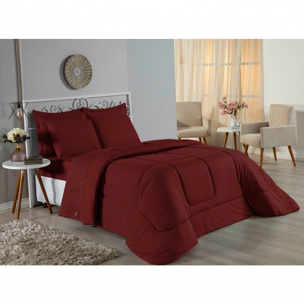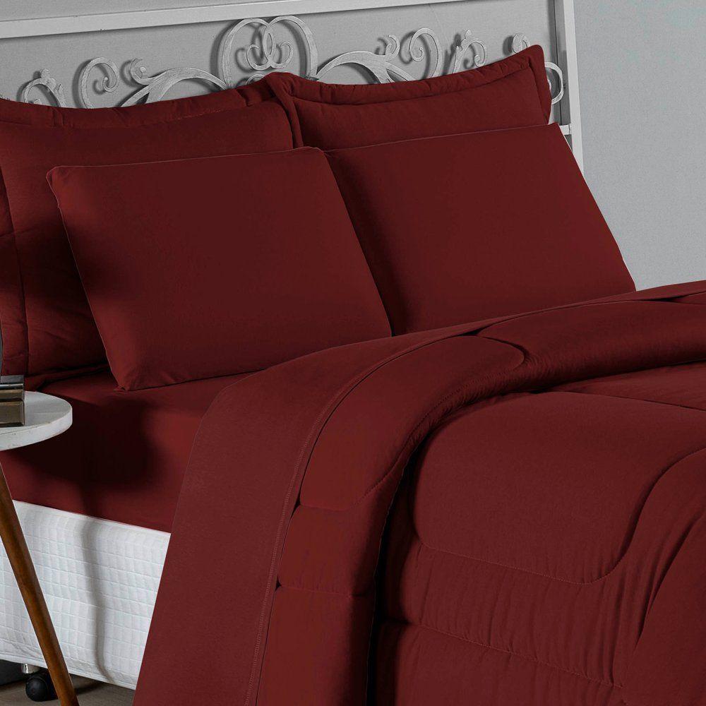 Kit Edredom Dupla Face + Jogo De Lençol Casal Nobre 6 Peças Malha 100% Algodão - VinhoTransforme seu quarto em um ambiente de descanso luxuoso com o Kit Cama Completa Casal Nobre 6 Peças. A união perfeita entre a praticidade do dia a dia e o conforto superior da malha 100% algodão fio penteado.Por que este Kit é uma ótima escolha?- Toque Extremamente Macio: A confecção em Malha 100% Algodão Fio 30/1 Penteado proporciona uma sensação suave e natural, ideal para quem valoriza o conforto da pele.- Visual Sofisticado: O edredom dupla face e os dois porta travesseiros matelados conferem volume e elegância à cama, dispensando composições difíceis.- Durabilidade Superior: O fio penteado garante um tecido resistente, que mantém a aparência de novo e não forma bolinhas (anti-pilling).- Ajuste Perfeito: O lençol de baixo com elástico abraça colchões de até 30cm de altura, mantendo a cama sempre organizada.Produto composto por (Total 06 Peças):Do Kit Edredom (03 Peças):01 Edredom Casal Dupla Face: 2,00m x 2,20m02 Porta Travesseiros Matelados: 50cm x 70cmDo Jogo de Lençol (03 Peças):01 Lençol de Baixo com Elástico: 1,38m x 1,98m x 30cm02 Fronhas: 70cm x 50cmAtenção: Este kit é composto pelo jogo de cama essencial (lençol com elástico e fronhas) e não inclui o lençol de cima (sobre lençol).Composição:Tecido (Todas as peças): Malha 100% Algodão - Fio 30/1 PenteadoEnchimento (Edredom e Porta Travesseiros): 100% Poliéster (Edredom com fibra siliconada)Forro (Apenas Porta Travesseiros): 100% Polipropileno