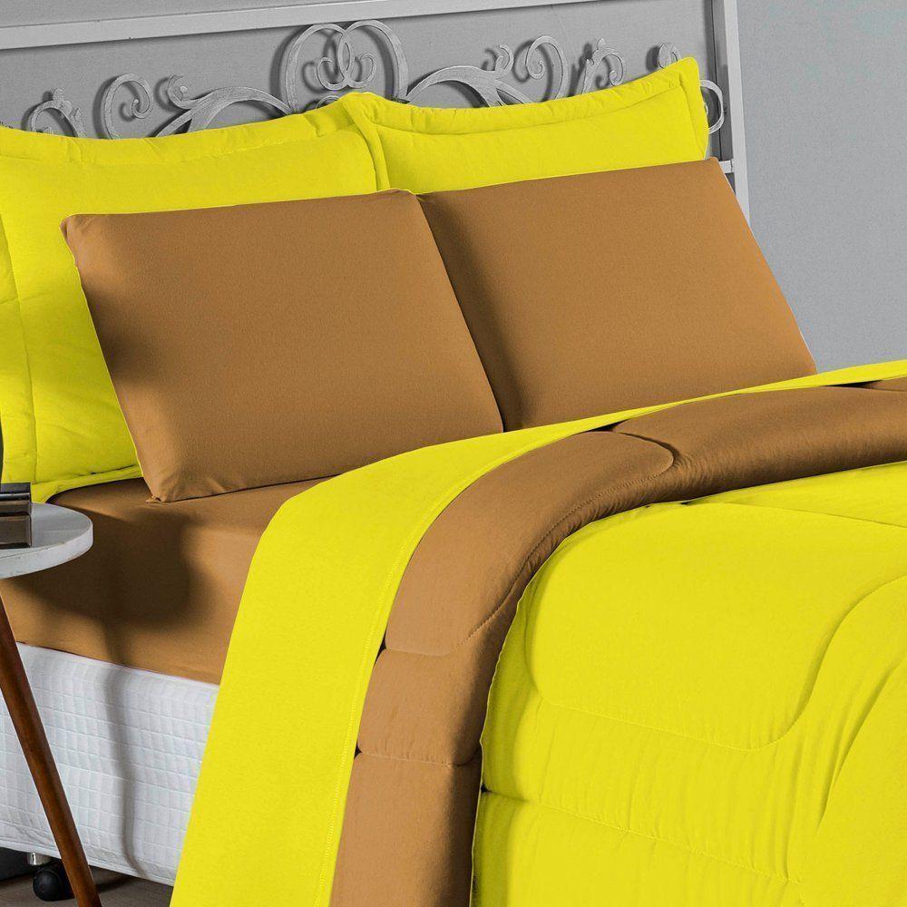 Kit Edredom Dupla Face + Jogo De Lençol Casal Nobre 7 Peças Malha 100% Algodão - Amarelo / Cobre