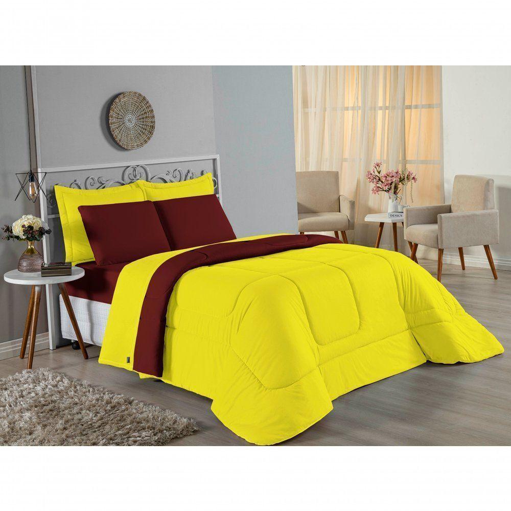 Kit Edredom Dupla Face + Jogo De Lençol Casal Nobre 7 Peças Malha 100% Algodão - Amarelo / VinhoVista sua cama com elegância total e conforto absoluto com o Kit Cama Completa Casal Nobre 7 Peças. A solução definitiva para quem busca um enxoval completo, coordenado e com a maciez irresistível da malha de algodão.Por que este Kit é uma ótima escolha?- Jogo Completo 7 Peças: Inclui edredom, porta travesseiros decorativos e o jogo de cama completo (com lençol de cima e de baixo), oferecendo a experiência completa de conforto.- Malha Premium: Confeccionado em 100% Algodão Fio 30/1 Penteado, garantindo um toque suave, natural e livre de bolinhas.- Versatilidade na Decoração: O edredom dupla face permite variar o visual, enquanto o lençol de cima com vira adiciona charme à cama posta.- Aconchego e Praticidade: Une o aquecimento do edredom à facilidade do lençol com elástico, perfeito para o dia a dia.Produto composto por (Total 07 Peças):Do Kit Edredom (03 Peças):01 Edredom Casal Dupla Face: 2,00m x 2,20m02 Porta Travesseiros Matelados: 50cm x 70cmDo Jogo de Lençol (04 Peças):01 Lençol de Cima (Virol): 2,40m x 2,20m01 Lençol de Baixo com Elástico: 1,38m x 1,98m x 30cm02 Fronhas: 70cm x 50cmComposição:Tecido (Todas as peças): Malha 100% Algodão - Fio 30/1 PenteadoEnchimento (Edredom e Porta Travesseiros): 100% Poliéster (Edredom com fibra siliconada)Forro (Apenas Porta Travesseiros): 100% Polipropileno