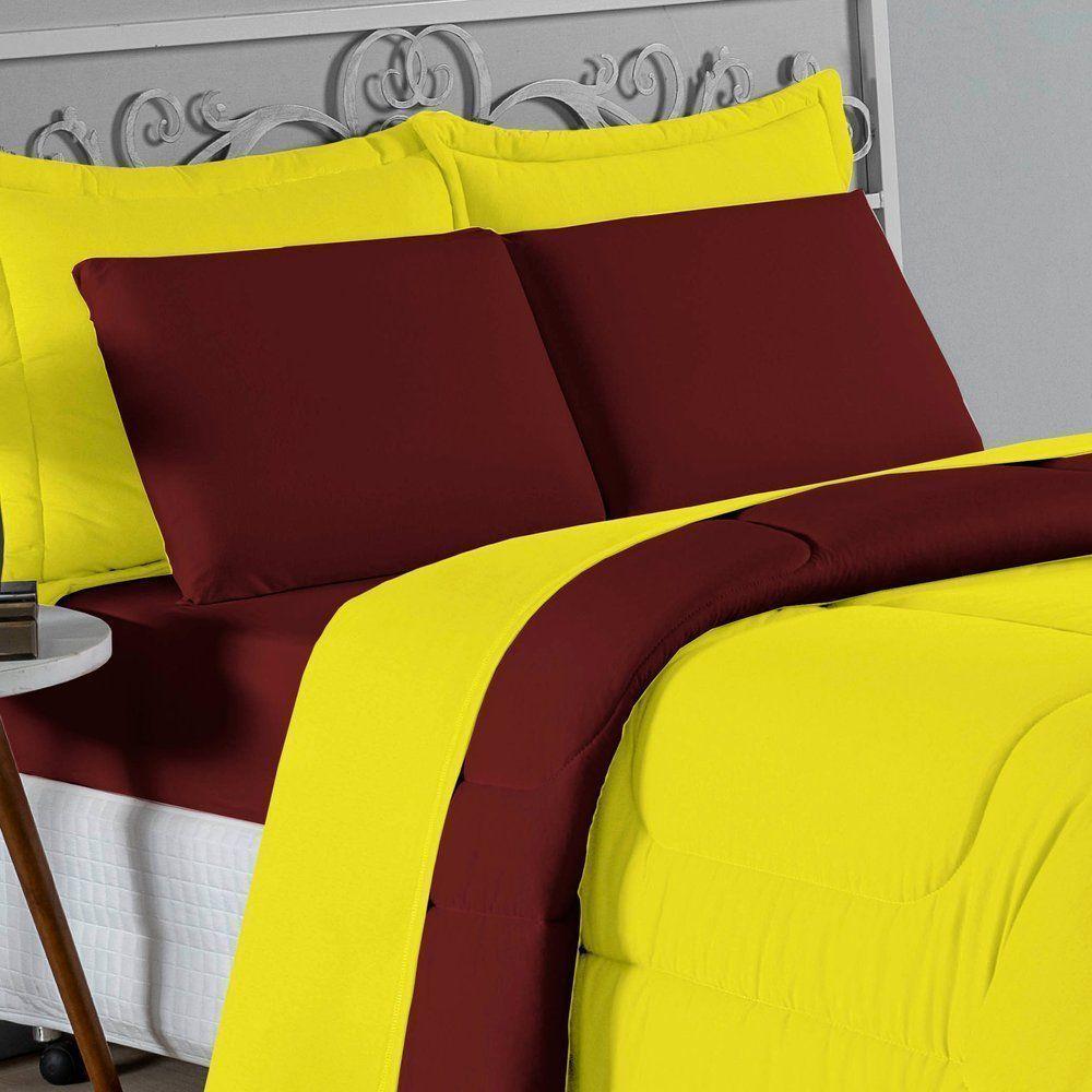 Kit Edredom Dupla Face + Jogo De Lençol Casal Nobre 7 Peças Malha 100% Algodão - Amarelo / Vinho