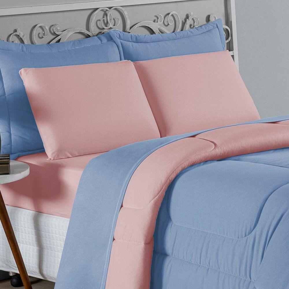 Kit Edredom Dupla Face + Jogo De Lençol Casal Nobre 7 Peças Malha 100% Algodão - Azul-bebê / Rosa-bebê