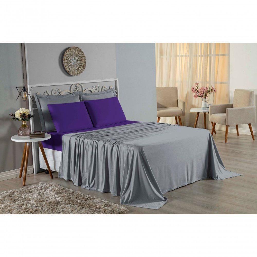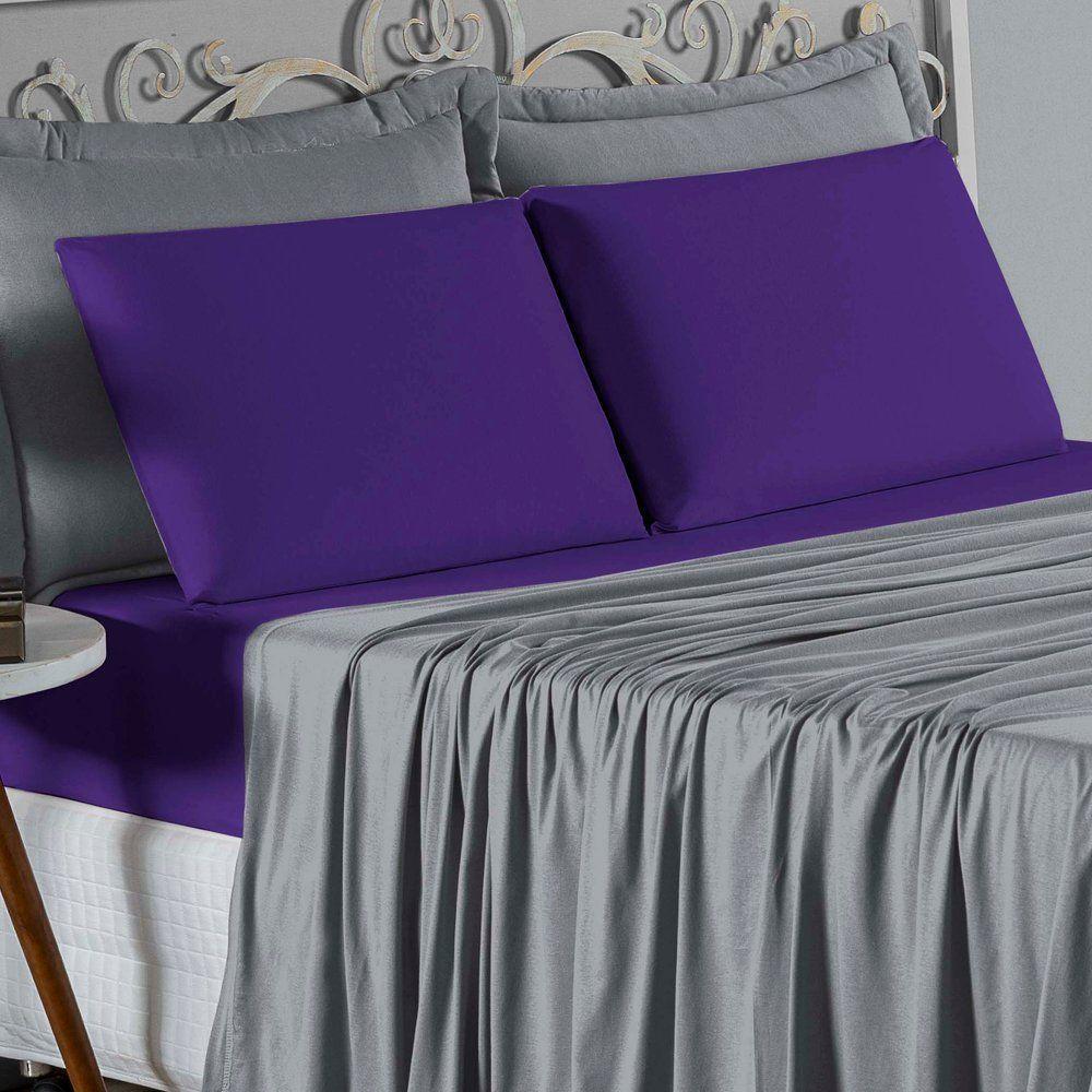 Jogo De Cama King Nobre 4 Peças Lençol Com Elástico De 30cm De Altura Malha 100% Algodão - Cinza / Roxo