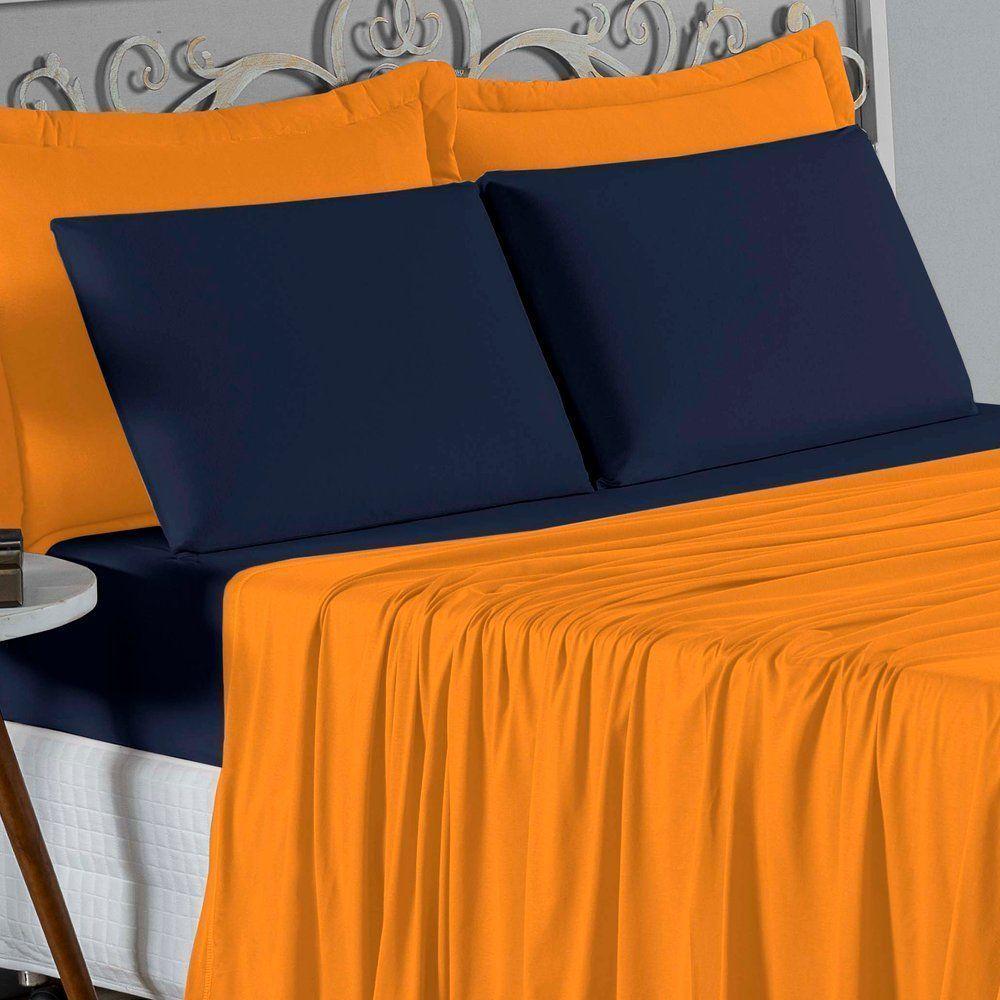 Jogo De Cama King Nobre 4 Peças Lençol Com Elástico De 30cm De Altura Malha 100% Algodão - Laranja / Azul-marinho