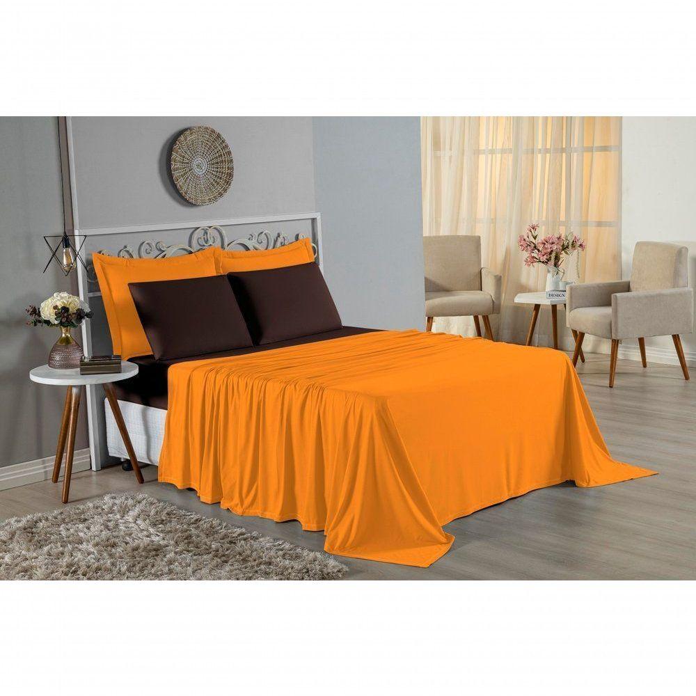 Jogo De Cama King Nobre 4 Peças Lençol Com Elástico De 30cm De Altura Malha 100% Algodão - Laranja / Marrom