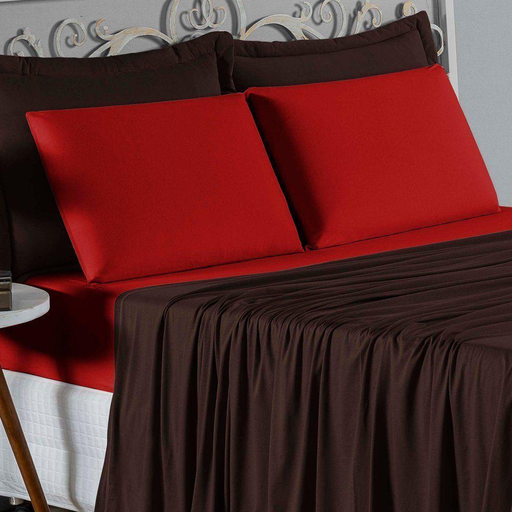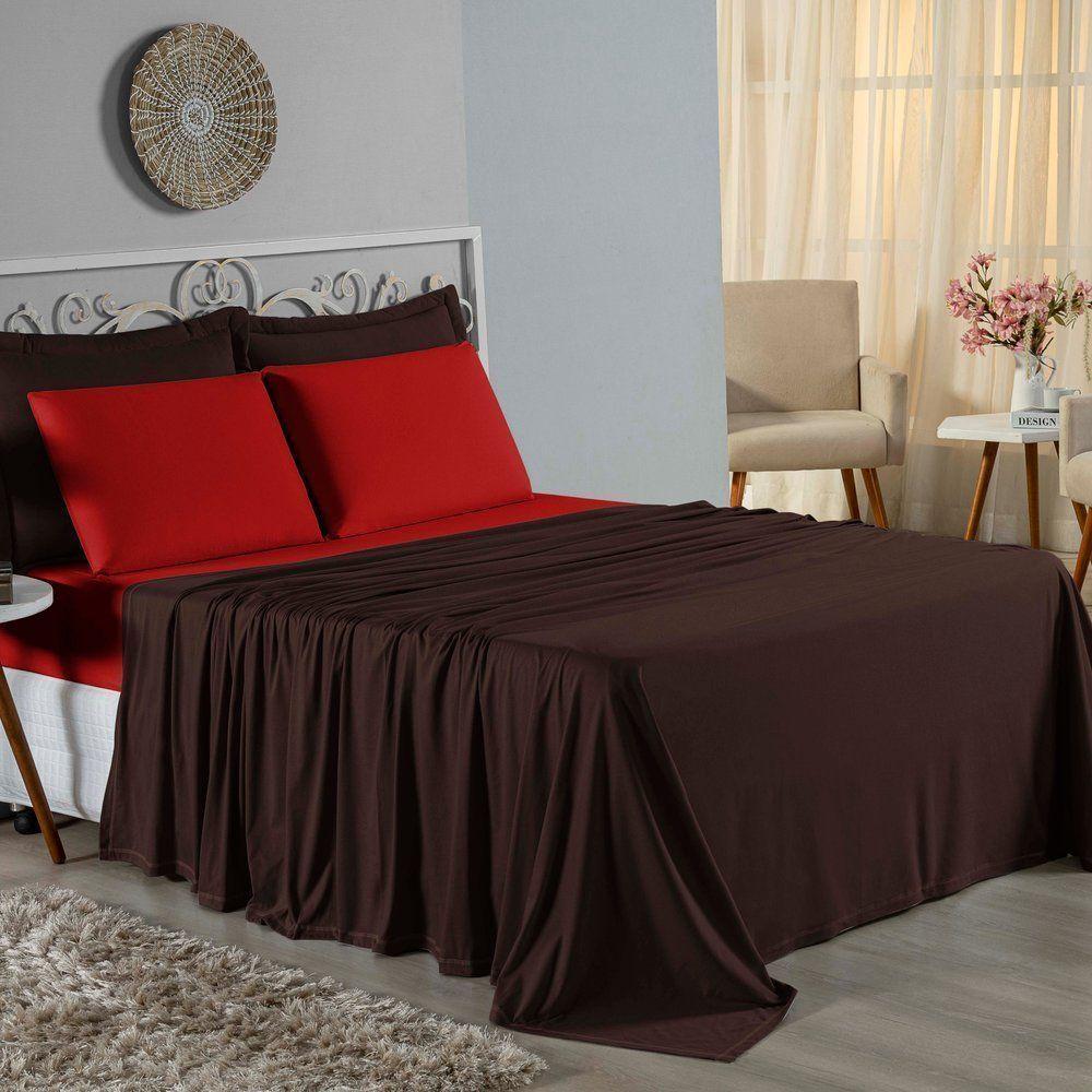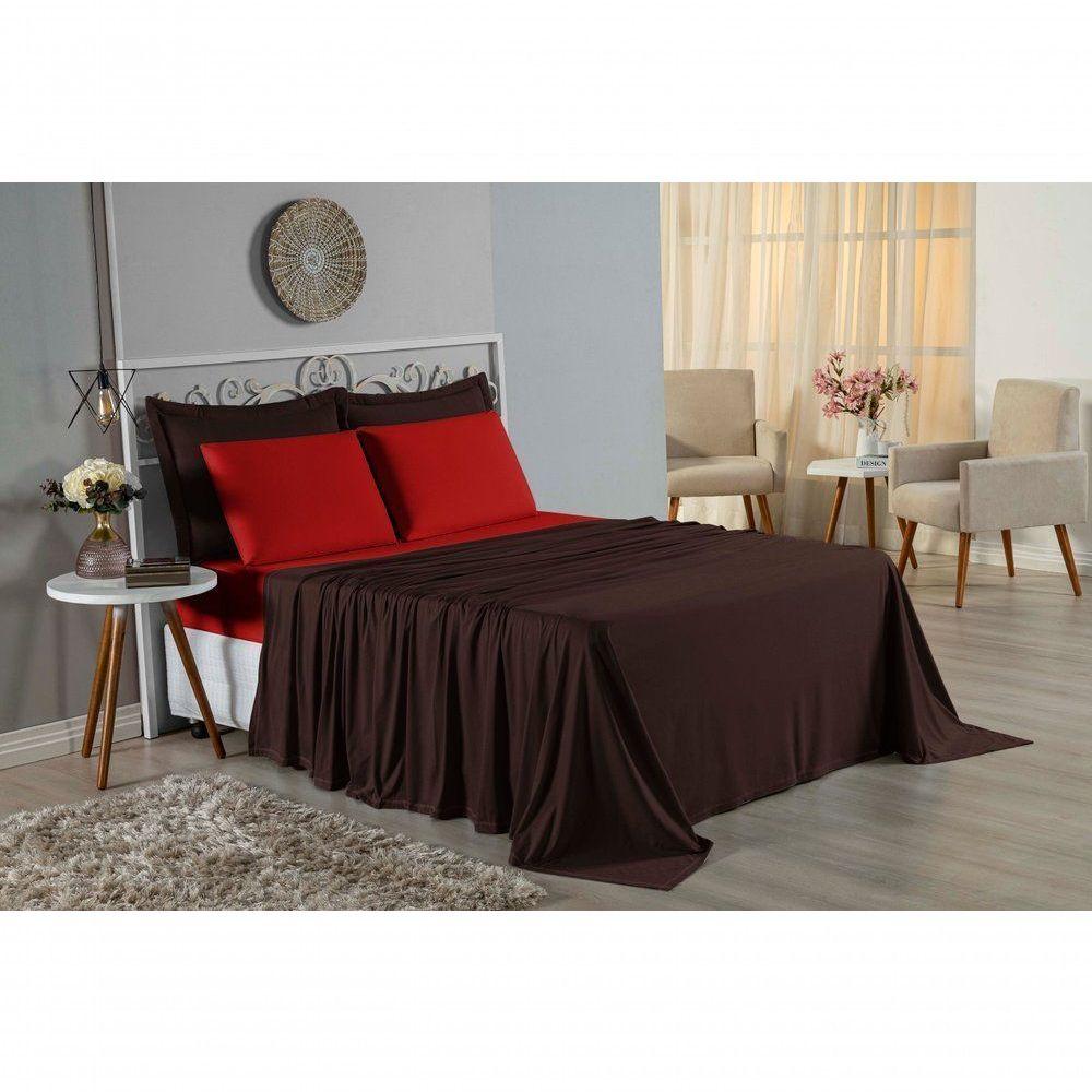 Jogo De Cama King Nobre 4 Peças Lençol Com Elástico De 30cm De Altura Malha 100% Algodão - Marrom / Vermelho