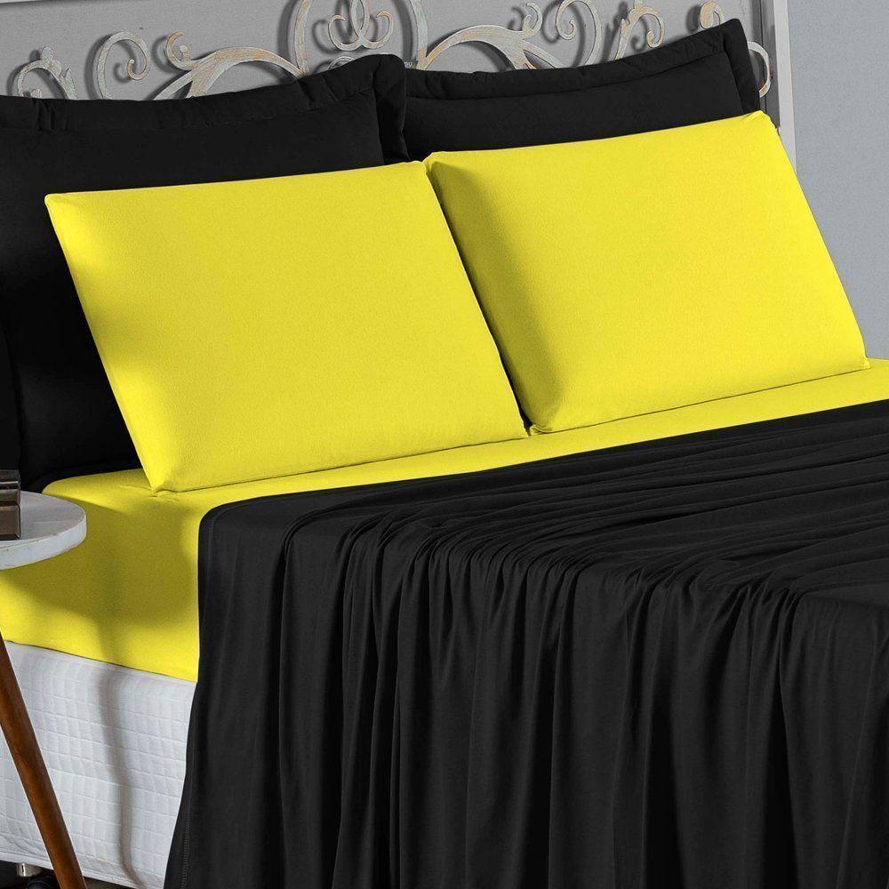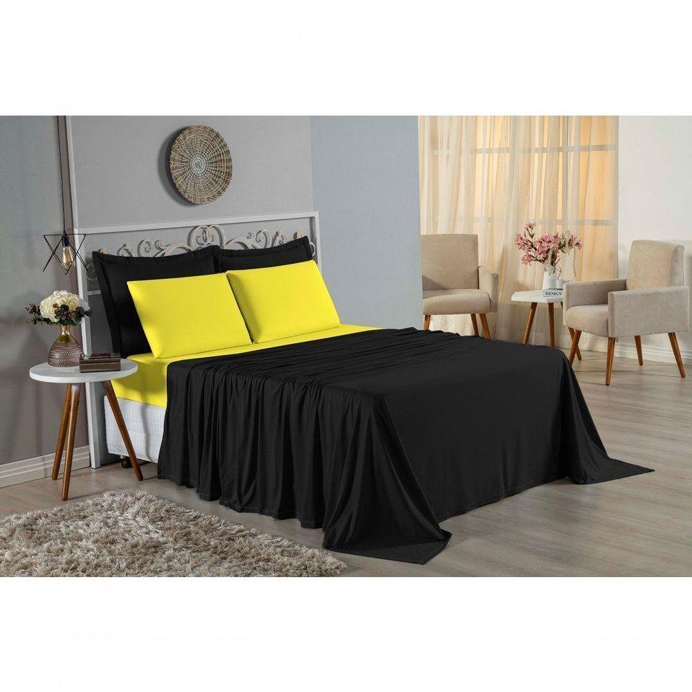 Jogo De Cama King Nobre 4 Peças Lençol Com Elástico De 30cm De Altura Malha 100% Algodão - Preto / Amarelo