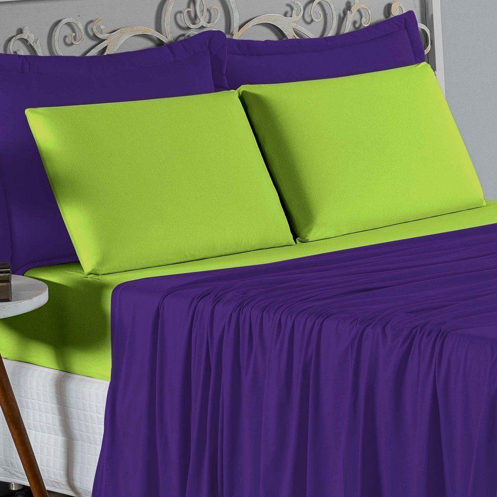 Jogo De Cama King Nobre 4 Peças Lençol Com Elástico De 30cm De Altura Malha 100% Algodão - Roxo / Pistache