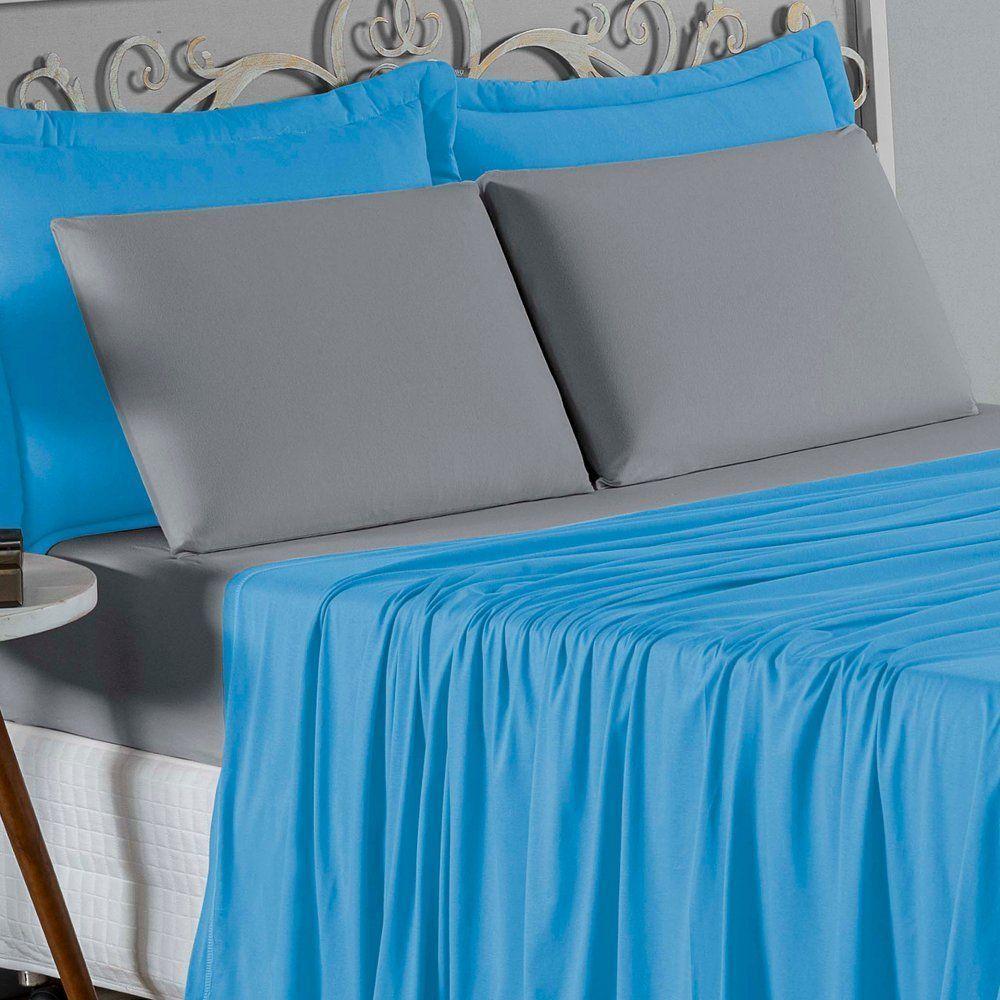 Jogo De Cama King Nobre 4 Peças Lençol Com Elástico De 30cm De Altura Malha 100% Algodão - Turquesa / Cinza