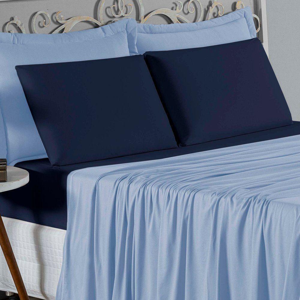 Jogo De Cama King Nobre 4 Peças Lençol Com Elástico De 30cm De Altura Malha 100% Algodão - Azul-bebê / Azul-marinho