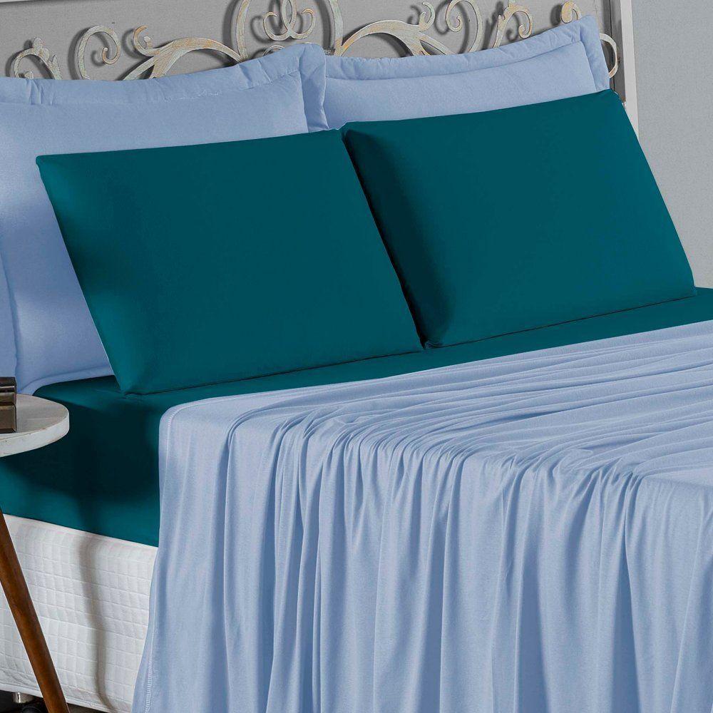 Jogo De Cama King Nobre 4 Peças Lençol Com Elástico De 30cm De Altura Malha 100% Algodão - Azul-bebê / Petróleo
