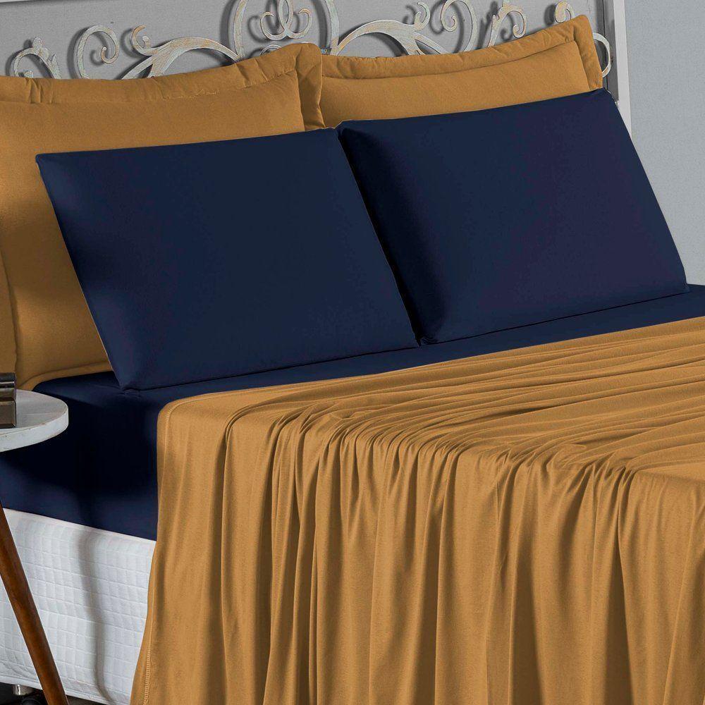 Jogo De Cama King Nobre 4 Peças Lençol Com Elástico De 30cm De Altura Malha 100% Algodão - Cobre / Azul-marinho