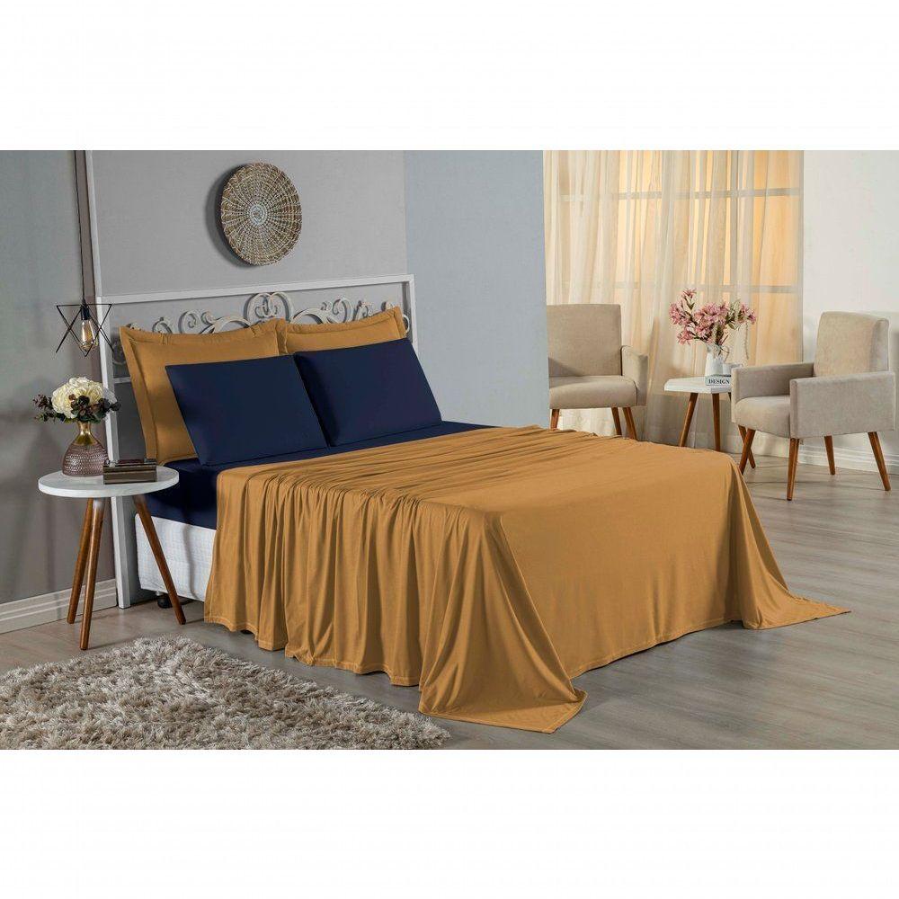 Jogo De Cama King Nobre 4 Peças Lençol Com Elástico De 30cm De Altura Malha 100% Algodão - Cobre / Azul-marinhoComplete a grandiosidade da sua cama com o Jogo de Cama King Nobre 4 Peças. Espaço, conforto e a pureza do algodão reunidos em um enxoval magnífico.Por que este Jogo de Cama é a escolha perfeita?- Máximo Conforto King: Desenvolvido para camas amplas, com um lençol de cima gigante (2,50m x 2,90m) que proporciona cobertura total e caimento impecável.- Puro Algodão: A composição 100% natural oferece um toque sedoso e fresco, essencial para um descanso reparador.- Fixação Ideal: O lençol de baixo abraça colchões King de até 30cm de altura, mantendo a cama sempre organizada.- Jogo Completo: Tudo o que você precisa para vestir a cama com elegância e funcionalidade em um único pacote.Produto composto por (Total 04 Peças):01 Lençol de Cima (Virol): 2,50m x 2,90m01 Lençol de Baixo com Elástico: 1,93m x 2,03m x 30cm02 Fronhas: 70cm x 50cmComposição:Tecido: Malha 100% Algodão - Fio 30/1 Penteado