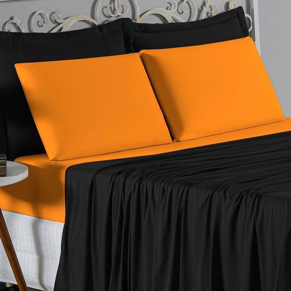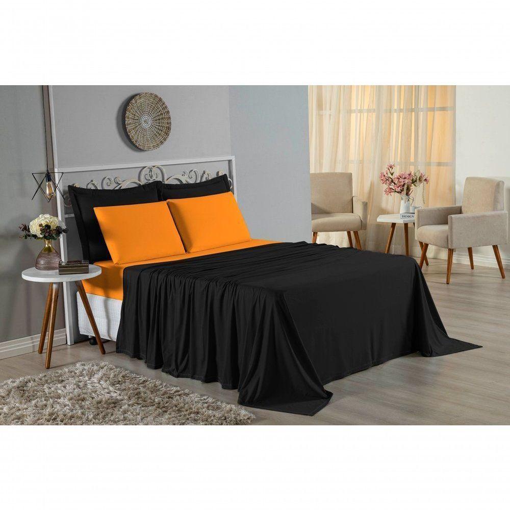 Jogo De Cama King Nobre 4 Peças Lençol Com Elástico De 30cm De Altura Malha 100% Algodão - Preto / Laranja