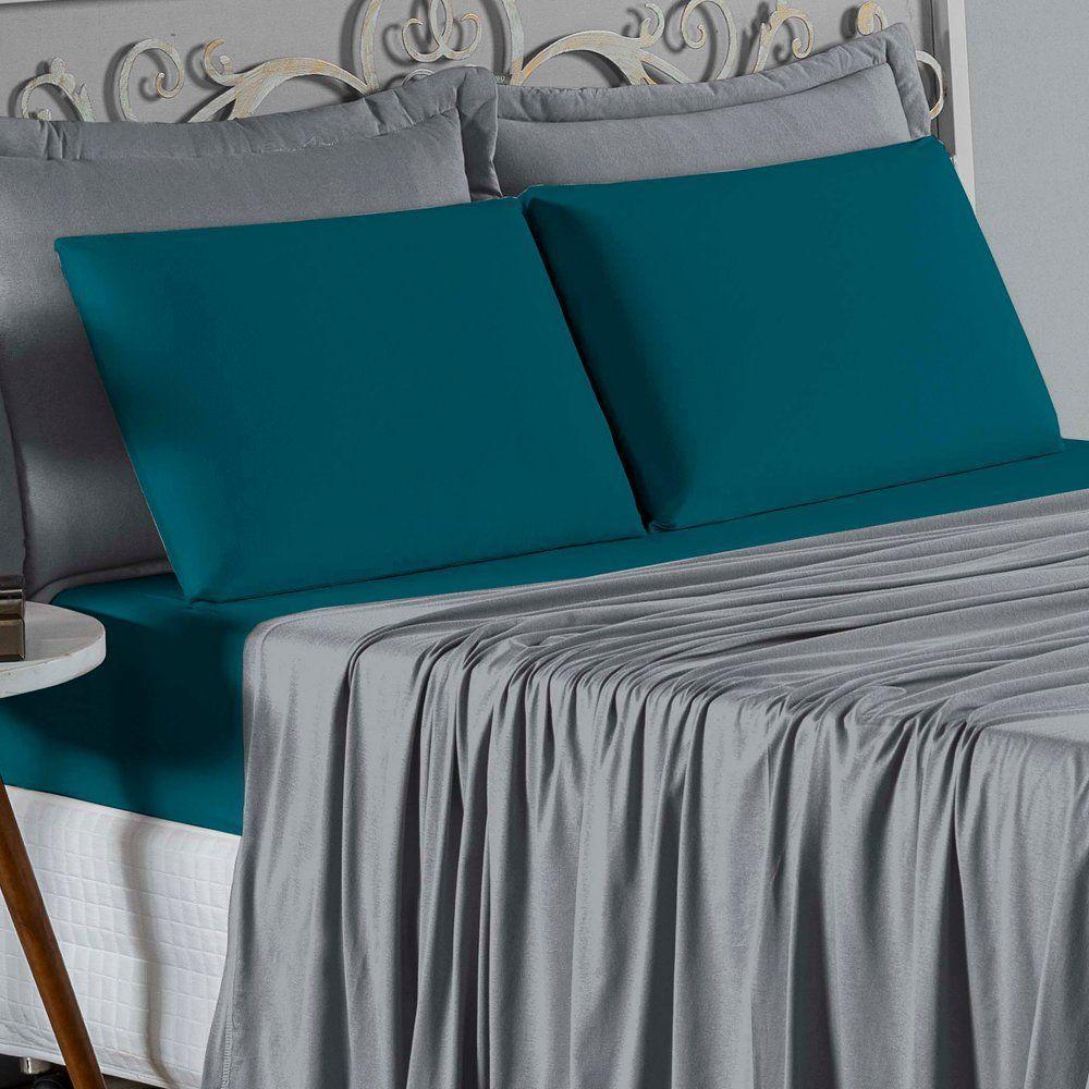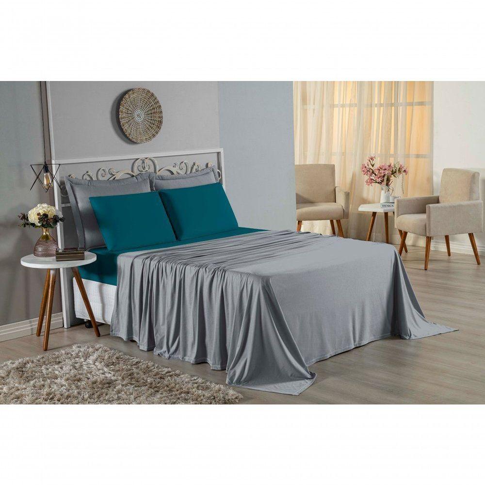 Jogo De Cama King Nobre 4 Peças Lençol Com Elástico De 30cm De Altura Malha 100% Algodão - Cinza / Petróleo