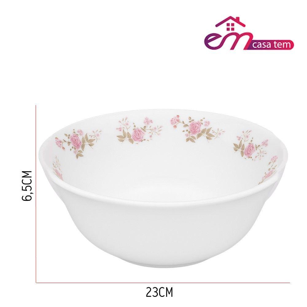 Jogo De Sobremesa De Vidro 1 Tigela 1400ml E 4 Bowls 400ml Branco Em Casa TemJogo de Sobremesa de Vidro 1 Tigela 1400ml e 4 Bowls 400ml Branco Em Casa TemPara o serviço de saladas, sobremesas, caldos e porções individuais, o conjunto integra uma tigela principal de 1400ml e quatro bowls de 400ml. Fabricado em vidro branco, o material não retém odores nem sabores, contribuindo para a higiene e pureza dos alimentos. A superfície lisa do vidro facilita a limpeza, e a estampa floral com rosas, presente nas peças, mantém a vivacidade das cores mesmo após lavagens frequentes, sem comprometer a integridade visual.A tigela de 1400ml oferece capacidade para servir pratos maiores, como saladas ou sobremesas para a família, enquanto os bowls de 400ml são adequados para porções individuais de cereais, sopas ou frutas. A compatibilidade com lava-louças e micro-ondas adiciona praticidade ao uso diário, permitindo aquecer alimentos ou simplificar a rotina de limpeza. O vidro confere resistência ao conjunto, suportando o uso contínuo na cozinha e à mesa.Conteúdo do Kit:Tigela Saladeira Grande Cumbuca Sobremesas Flowers Pink Vidro 1400ml 23cm Em Casa TemCódigo: 128133Marca: EmCasaTemMaterial: Vidro OpalinoDimensões do produto (AxLxC): 6,50x23,00x23,00cm cada unidadeQuantidade: 1 unidadeBowl Tigela Cumbuca Caldos Sobremesas Flowers Pink Vidro 400ml Em Casa TemCódigo: 126848Marca: EmCasaTemMaterial: VidroDimensões do produto (AxLxC): 5,00x12,50x12,50cm cada unidadeQuantidade: 4 unidades