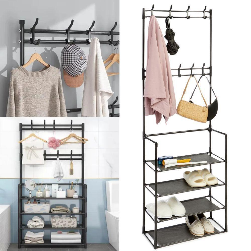 Organizador Roupas Sapatos Cabideiro Sapateira Multifuncional 4 Prateleiras Rack Porta Treco Cor:preto