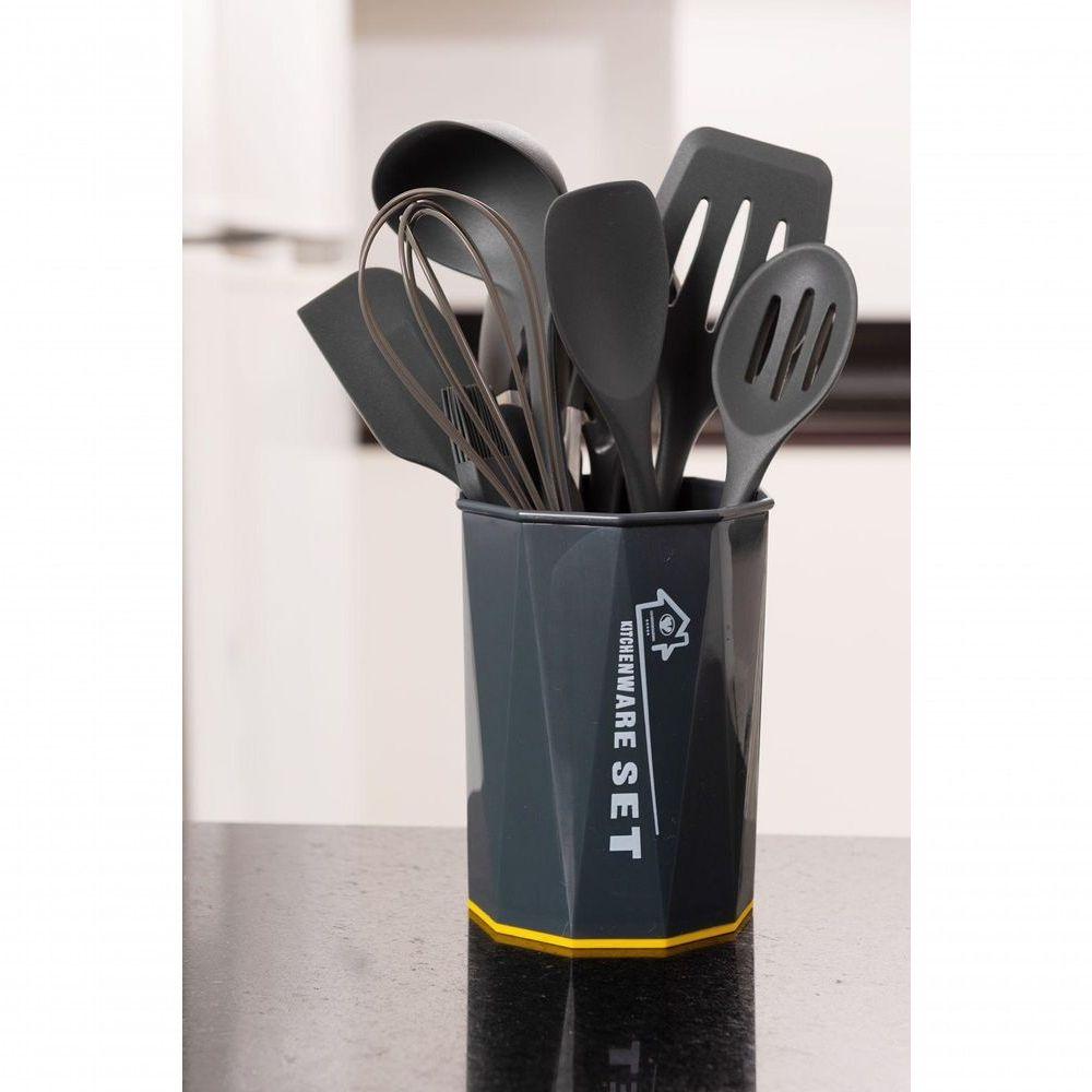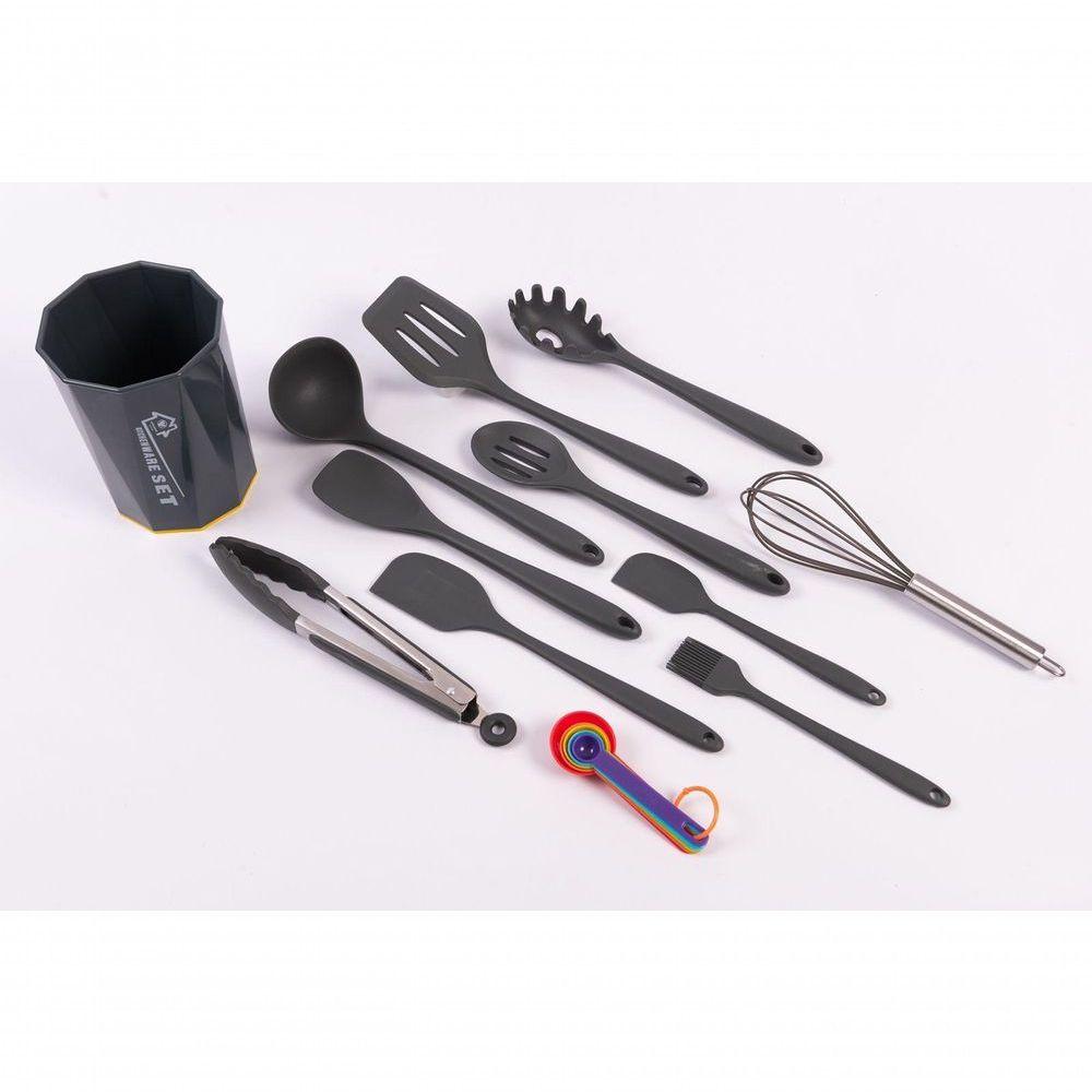 Kit C/11 Peças Utensílios De Cozinha SiliconeKit C/11 Peças Utensílios De Cozinha Silicone .Cor: GRAFITDescriçãoConfira o incrível kit de utensílios de silicone para sua cozinha.Com este KIT, sua cozinha vai ficar um LUXOKIT com diferentes itens de qualidade incontestável, para preparar e servir deliciosas receitas no seu dia a dia na cozinha.Neste Super Kit você recebe 11 Peças:1- Colher em Silicone1- Pegador de Macarrão1- Escumadeira em silicone1- Concha em silicone1- Espátula Reta Vazada1- Colher de Servir Arroz1- Espátula de Silicone Raspadora1- Mini Espátula Raspadora1- Pincel de Silicone1- Pinça Pegador Culinário1- PoteJogo Completo de utensílios em silicone maciço que não danificam suas panelas e trazem total beleza para sua cozinha, realmente a qualidade é incrível. O cabo é bem rígido para ter segurança e praticidade no manuseio e preparo de receitas. Suportam altas temperaturas até 230ºC e não riscam suas panelas. Fácil de limpar e guardar. Kit excelente para o dia a dia.Super Conjunto de 11 utensílios, fabricação de alto nível, todos os itens são super resistentes, use com total tranquilidade, ganhe agilidade para preparar suas refeições e servir seus convidados.- Itens em silicone maciço, podem ficar apoiados na panela direto no fogão, pois suportam altas temperaturas até 230ºC.- Não riscam suas panelas- Super fácil de limpar e no tamanho ideal para guardar em seu armário ou até mesmo pendurar na sua parede (Suporte não incluso).- Fabricação de alto nível, resistência e durabilidade garantida- Super Lindo com design perfeito para preparar e servir suas receitas- Podem ir na lava-louças