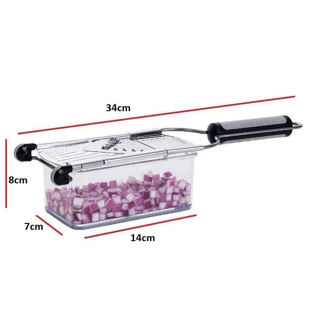 Fatiador E Cortador Multifuncional Nicer Dicer Speed Em Inox Com Pote – Kit 9 Peças Para Legumes, Queijos E MaisFatiador e Cortador Multifuncional Nicer Dicer Speed em Inox com Pote – Kit 9 Peças para Legumes, Queijos e MaisVelocidade, Precisão e Versatilidade na Sua CozinhaTransforme o preparo dos seus pratos com o Nicer Dicer Speed, um cortador multifuncional projetado para oferecer cortes rápidos, precisos e profissionais. Fabricado em aço inoxidável de alta qualidade, ele conta com lâminas extra afiadas G-NOX, ideais para fatiar, ralar, picar e cortar diversos alimentos, desde vegetais macios até ingredientes mais firmes, tudo com praticidade e segurança.Destaques do ProdutoVersátil e Completo: Fatiador, ralador, cortador em julienne e muito mais em um único kit.Lâminas G-NOX de Alta Precisão: Cortes perfeitos em alimentos duros ou macios.Corte Rápido: Até 6 fatias com apenas 1 movimento.Design Funcional: Corte direto no pote, panela, tigela ou recipiente.Material Premium: 100% aço inoxidável resistente à ferrugem.Funções e AplicaçõesFatiador de legumes e frutas.Ralador de queijos, nozes e vegetais.Cortador de cebola, abobrinha, batata, cenoura e muito mais.Ideal para saladas, acompanhamentos e preparos rápidos.Especificações TécnicasMaterial: Aço inoxidável de alta qualidade e componentes duráveis.Medidas: 8 cm (A) x 7 cm (C) / 34 cm com fatiador.Conteúdo da Embalagem1 moldura.1 multi-fatiador com 3 lâminas.1 inserto fatiador com julienne.1 inserto ralador fino.1 suporte para material de corte.1 alavanca para remoção do material cortado.BenefíciosMais rapidez no preparo das receitas.Mantém cortes uniformes e apresentação impecável.Economia de tempo e esforço na cozinha.Fácil de limpar e armazenar.Garanta o seu agora e leve para sua cozinha a eficiência e qualidade de um fatiador profissional!