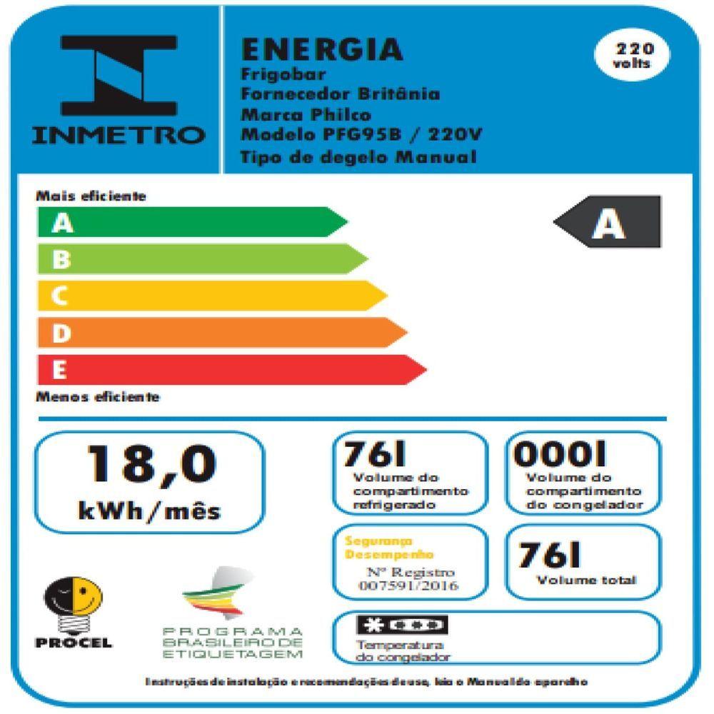 Frigobar Philco PFG95B 76 Litros 220VO Frigobar PFG95B Philco é perfeito para você que busca o melhor para a sua casa! Ele tem capacidade para 76 Litros, garantindo o melhor aproveitamento de espaço. Compacto por fora, espaçoso por dentro! Ele ainda é ecologicamente correto, pois é livre de CFC e possui classificação de energia A. O Frigobar conta com gaveta extra para legumes e verdura, compartimento para latas e garrafas, porta reversível e ainda controle de temperatura com ajuste, te proporcionando o melhor! Principais Cracaterísticas- Compacto e econômico- Capacidade 76 litros- Classe "A" em eficiência energética- Sistema de refrigeração com compressor- Controle de temperatura com ajustes Mínimo, Médio e Máximo de 0 a 10°C- Compartimento extra frio com temperatura de 0 a -5°C- Compartimentos para armazenamento para latas e garrafas- Prateleiras removíveis - Pés com regulagem ajustável- Porta Reversível- Degelo Manual- Sem iluminação interna- Puxador plástico- Gás refrigerante R600 -Livre de CFCObservação: Somente faturamos para o nosso consumidor final, ou seja, não faturamos pedidos para CNPJ por este portal de vendas.Especificações TécnicasMarca: PhilcoModelo: PFG95BCor: BrancoCapacidade: 76 LEstado: Altura do produto: 70 cmLargura do produto: 48 cmComprimento do produto: 45 cmPeso do produto: 17,6 kgAltura com embalagem: 71,8 cmLargura com embalagem: 49,2 cmComprimento com embalagem: 46,3 cmPeso com embalagem: 19,3 kgGarantia: 360 Dias