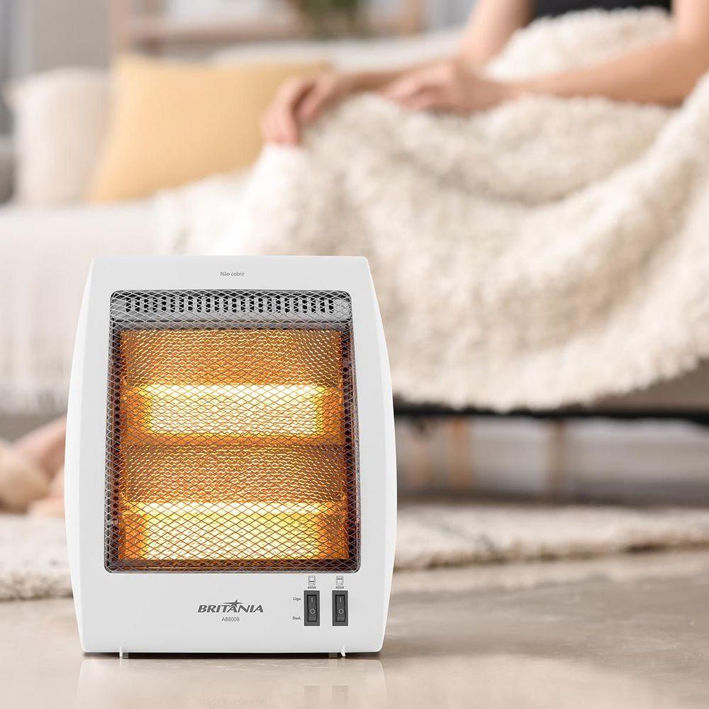 Aquecedor Britânia 2 Níveis De Potência 800W AB800B 110VSinta-se acolhido nos dias frios com o Aquecedor Britânia 2 Níveis de Potência 800W AB800B. Com design compacto e silencioso, ele leva calor e bem-estar para seu lar de forma prática e segura. Seu funcionamento com lâmpada halógena garante aquecimento instantâneo, sem ruídos incômodos.A placa difusora suaviza a iluminação gerada pela resistência, criando uma atmosfera aconchegante e relaxante. Com dois níveis de potência, você controla o calor conforme a sua necessidade, seja para aquecer o ambiente ao acordar ou antes de dormir.A segurança é prioridade: a grade protetora e o sistema de desligamento automático em caso de tombamento protegem sua família. Além disso, a proteção contra sobreaquecimento traz tranquilidade durante o uso prolongado.Compacto e com alça de transporte, o Aquecedor Britânia 2 Níveis de Potência vai com você onde o conforto for necessário. Descubra o prazer de viver momentos mais quentes, com a qualidade e tradição da Britânia.Principais Características- Aquecedor com resistência halógena- Potência de 800W com 2 níveis ajustáveis- Placa difusora: reduz brilho e melhora dispersão do calor- Baixo ruído: funcionamento silencioso- Sistema antiqueda com desligamento automático- Grade protetora para maior segurança- Proteção contra sobreaquecimento- Cordão elétrico de 1,20 m- Alça para transporteObservação: Somente faturamos para o nosso consumidor final, ou seja, não faturamos pedidos para CNPJ por este portal de vendas.Especificações TécnicasMarca: BritâniaCor: BrancoModelo: AB800BPotência: 800 WConsumo: 0,8 (kW/h)Modo de aquecimento: Lâmpadas de HalogênioControle de temperatura: 2 opçõesAltura do produto: 36 cmLargura do produto: 29,5 cmComprimento do produto: 13,5 cmPeso do produto: 1,2 kgAltura com embalagem: 41 cmLargura com embalagem: 30 cmComprimento com embalagem: 14,5 cmPeso com embalagem: 1,106 kgGarantia: 360 Dias