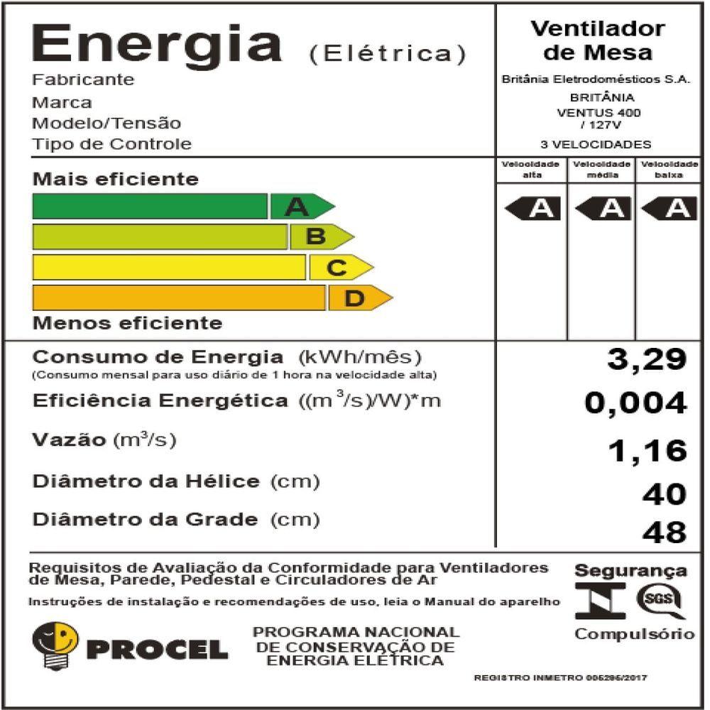 Ventilador Britânia Ventus 400 Turbo Maxx Force 6 220VRefresque-se e relaxe enquanto os ventos do Ventilador Britânia Ventus 400 Turbo Maxx Force 6 afastam o calor e proporcionam maior conforto e bem-estar para você. Seja qual for o ambiente! Por ser 2 em 1, ele pode ser utilizado como Ventilador de mesa ou Ventilador de parede. Você escolhe! O Ventilador Britânia Ventus é ideal para suas necessidades, pois conta com 3 velocidades: Suave, moderado e intenso, o que resulta numa alta performance de ventilação.Só a Tecnologia Maxx Force 6 proporciona uma hélice com 6 pás, desenvolvidas para garantir um excelente desempenho. E para melhor distribuição do ar, o sistema oscilante do ventilador permite a ampla distribuição no ambiente. Não para por aí! Com estrutura prática, a sua grade plástica é removível e facilita muito na hora de montar, desmontar e limpar. Tudo de forma muito segura, pois é produzido de acordo com a norma internacional de segurança.Simples para levar e na hora de guardar, pois possui alça para transportar e porta fio.Comodidade e seus dias mais agradáveis com o do Ventilador Britânia Ventus 400 Turbo Maxx Force.- 3 velocidades- Hélice de 6 pás- Potência de 140W- Grade que obedece às normas de segurança (contato com partes móveis)- Oscilação horizontal automática com novo sistema de acionamento (botão integrado à carcaça)- Sistema de articulação para ajuste da inclinação vertical -Porta-fio- Novo sistema de travamento entre grade frontal e traseira- Alça na grade traseira para transportar o aparelho- Motor com fusível térmico de segurança.Especificações Técnicas:Marca: BritâniaCor da Estrutura: PretoModelo:Ventus 400Cor das Pás: CinzaQuantidade de pás: 6Potência (W): 140 WTipo: De mesaDiâmetro (cm): 40Função repelente: NãoMaterial das Pás: PlásticoGarantia (Dias): 360Observação: Somente faturamos para o nosso consumidor final, ou seja, não faturamos pedidos para CNPJ por este portal de vendas;