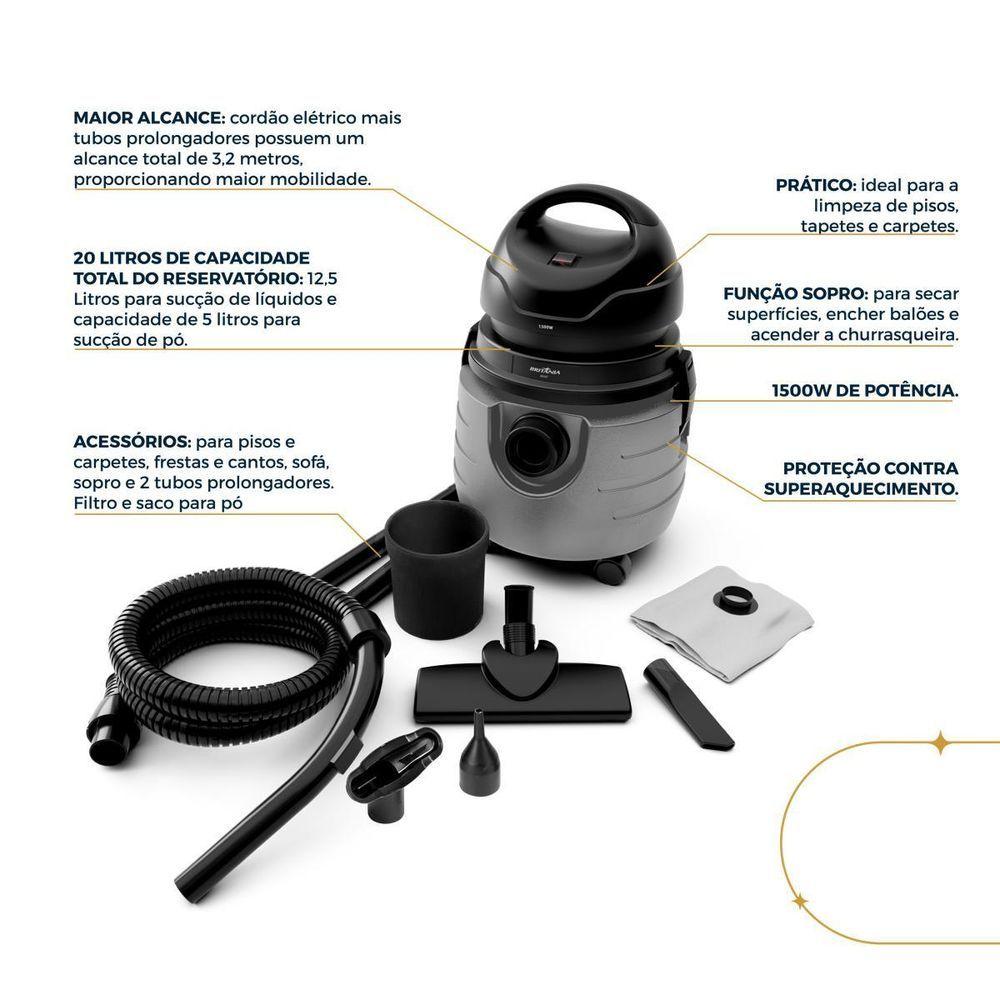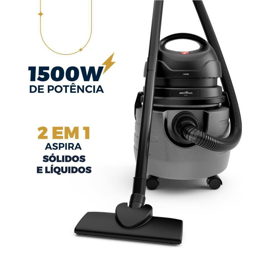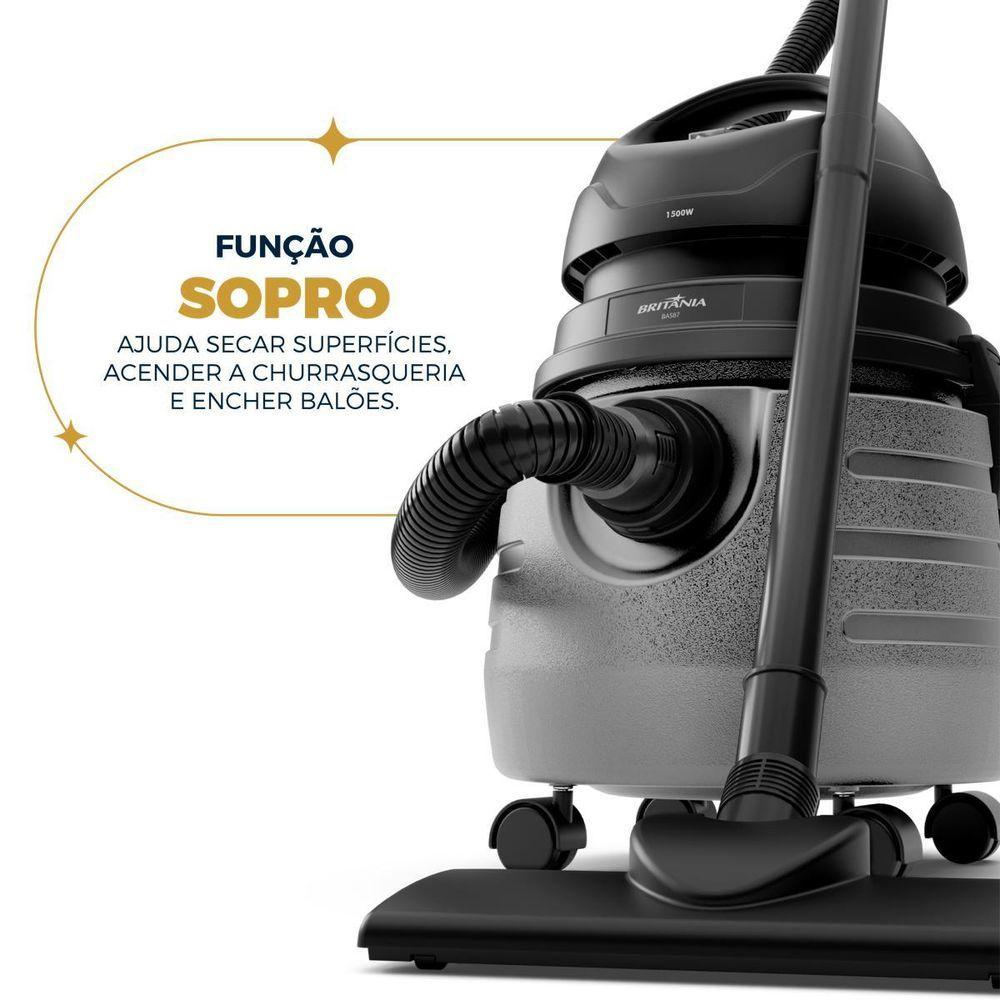 Aspirador De Pó Britânia 20L Função Sopro BAS87 110VImagine eliminar toda a sujeira da sua casa com um único equipamento. O Aspirador de Pó Britânia BAS87 combina 1500W de potência e 20L de capacidade para resolver desde limpezas rotineiras até aqueles desafios mais difíceis. Com ele, você aspira pó, líquidos e até sujeiras persistentes em ambientes internos e externos, sem precisar parar para esvaziar o recipiente a todo momento.A função sopro transforma seu aspirador em um aliado versátil: encha colchões de ar, balões ou acenda a churrasqueira com facilidade. Os acessórios completos incluídos garantem limpeza em pisos, carpetes, cantos e móveis, enquanto as rodinhas ágeis e o cabo de 3,2 metros oferecem mobilidade para limpar grandes áreas sem trocar de tomada.Com filtro lavável e design prático, o Aspirador de Pó Britânia 20L 1500W BAS87 é a solução inteligente para quem busca eficiência e durabilidade. Adquira já e transforme a limpeza da sua casa em uma tarefa rápida e satisfatória!Principais CaracterísticasPotência: 1500WEspecificação do plug (A): 10ACapacidade total do reservatório de pó (L): 20 litrosAlcance (m): 3,2 metrosTamanho da base (cm): 26cmAcessórios: 01 acessório para pisos e carpetes, 01 acessório para frestas e cantos, 01 acessório para sofá, 01 para sopro, 02 tubos prolongadoresRodinhas para movimentação: 4 rodinhasFuncionamento com fioSuporte para enrolar o cordão Capacidade de sucção (mbar): 12,5 litros para sucção de líquidos e 5 litros para sucção de póAlça para transportarGiro da base: 30° de inclinação e 180° de giro.Observação: Somente faturamos para o nosso consumidor final, ou seja, não faturamos pedidos para CNPJ por este portal de vendas.Especificações TécnicasMarca: BritâniaModelo: BAS87Função Soprar: SimAspira Líquidos: SimEstado: NovoCapacidade: 20 LPotência (W): 1500WComprimento cordão elétrico (metros): 2,82Consumo (kW/h): 1,5Porta fio: SimNível de ruído (dB): 94Cor: PretoTipo: Com rodasAcessórios: 01 acessório para pisos e carpetes, 01 acessório para frestas e cantos, 01 acessório para sofá, 01 para sopro, 02 tubos prolongadores.Altura do produto: 52 cmLargura do produto: 35,8 cmComprimento do produto: 35,8 cmPeso do produto: 4,495 kgAltura com embalagem: 50 cmLargura com embalagem: 35,4 cmComprimento com embalagem: 35,3 cmPeso com embalagem: 5,306 kgGarantia (meses): 12