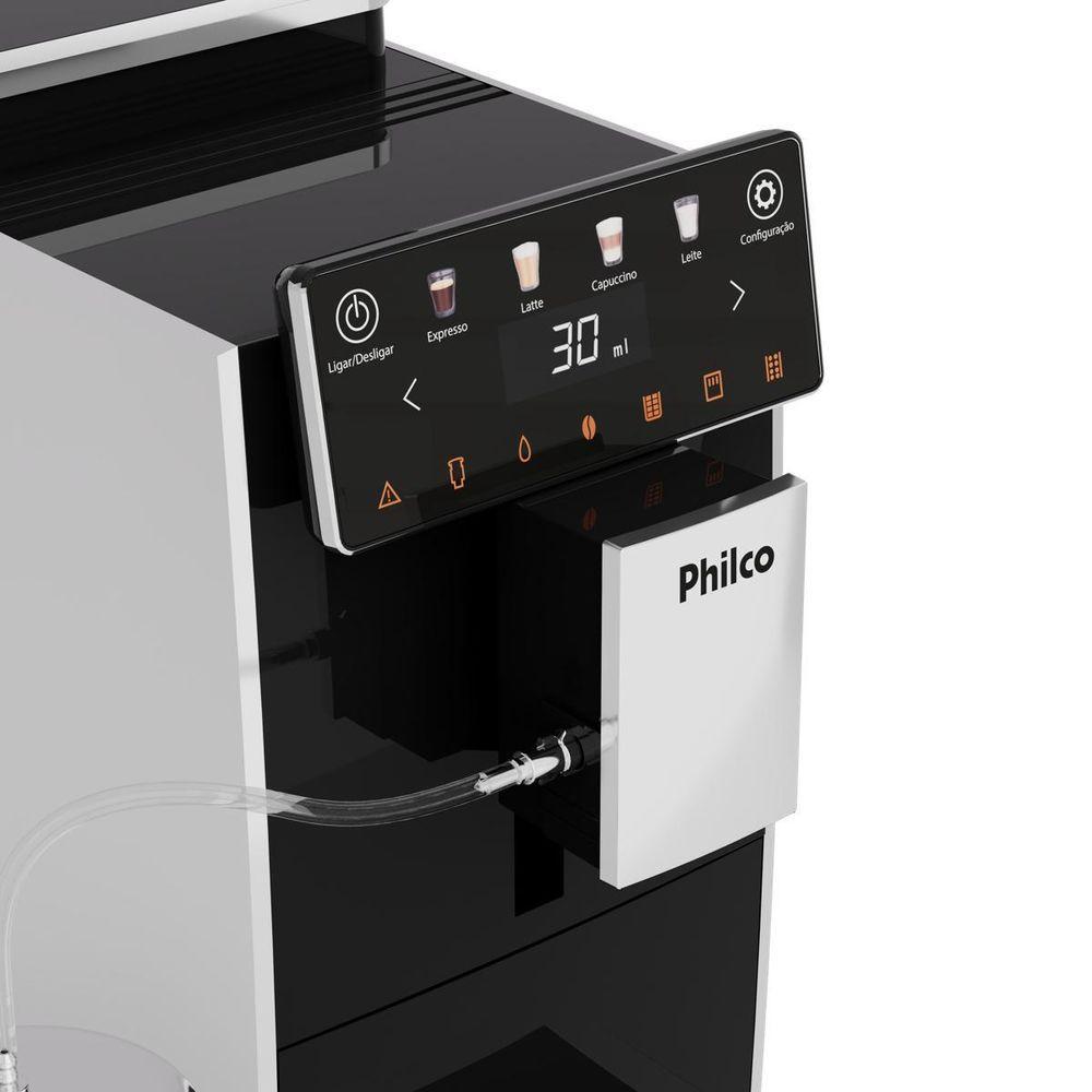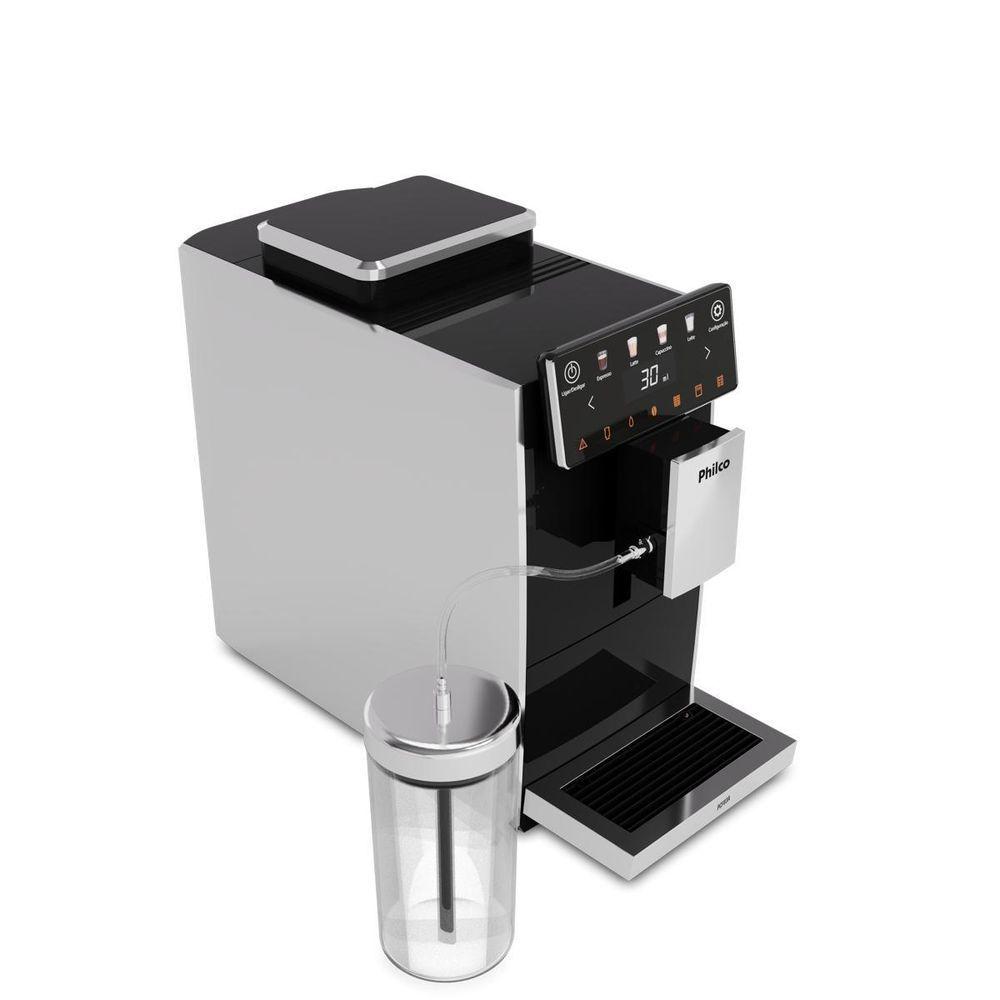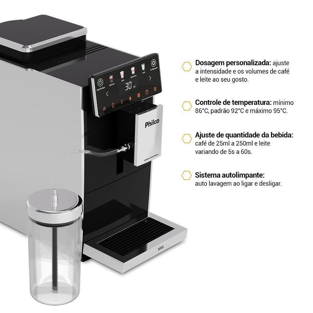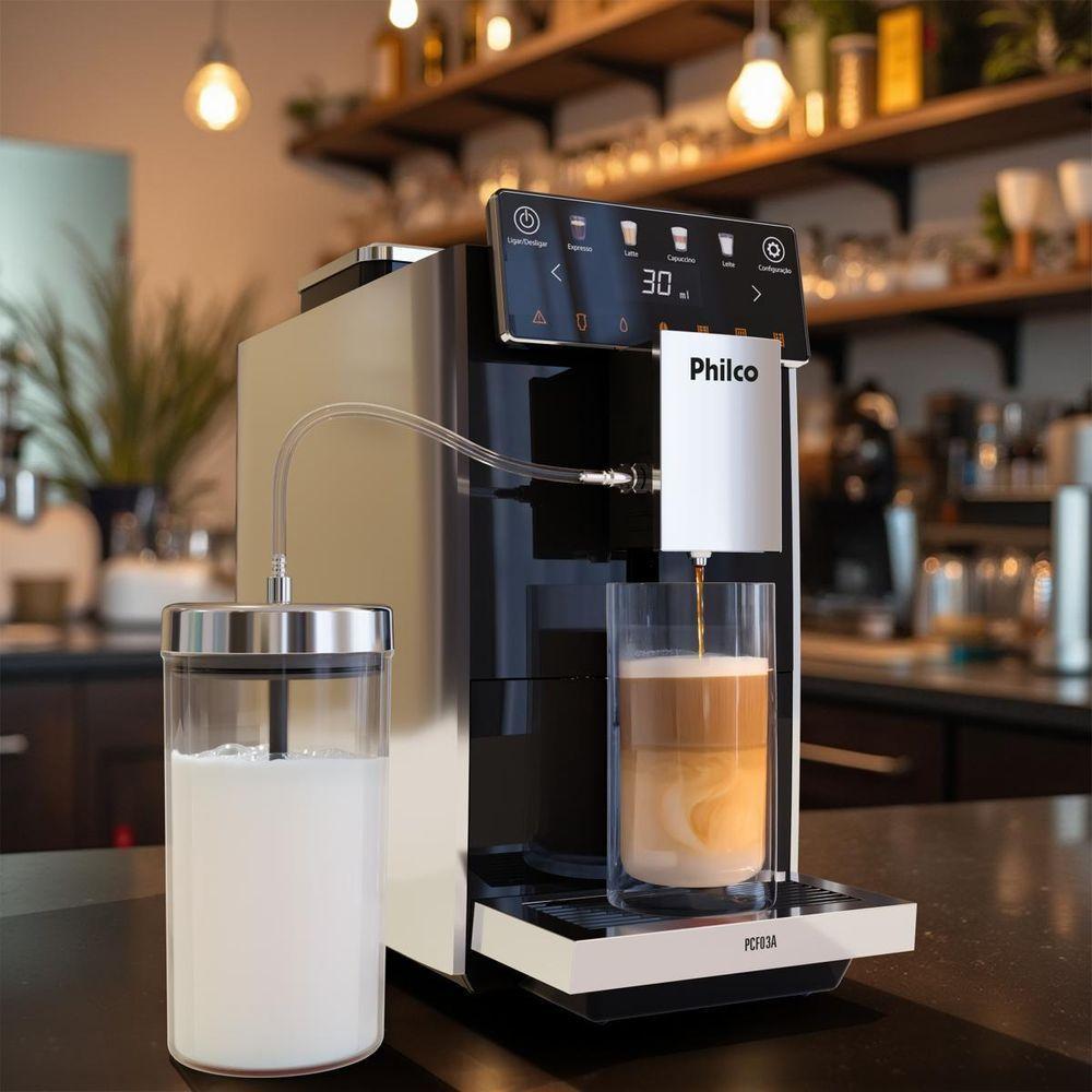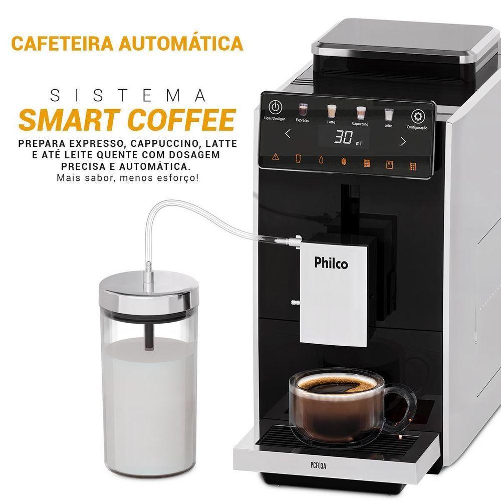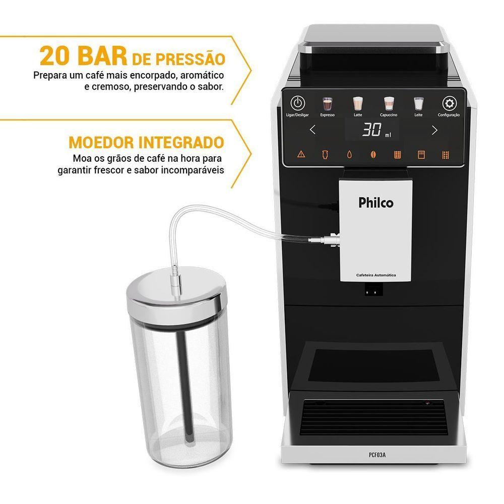 Cafeteira Expresso Philco 20 Bar 1,2L Com Moedor PCF03A 220VA Cafeteira Expresso Philco PCF03A foi desenvolvida para quem busca café com padrão profissional no conforto de casa. Com pressão de 20 Bar e reservatório de água de 1,2L, permite preparar até duas xícaras simultaneamente. Ideal para compartilhar momentos ou aproveitar um café intenso em dose dupla.O moedor de café integrado com 5 níveis de moagem garante grãos moídos na hora, preservando aroma e frescor em cada preparo. Além disso, o sistema expresso da Cafeteira Philco PCF03A entrega cafés encorpados em poucos segundos. Tudo isso com controle total da intensidade da bebida.A Cafeteira Philco conta com reservatório de leite de 680ml, permitindo preparar cappuccinos, lattes e leite espumado de forma automática. A quantidade da bebida é personalizável, com ajuste de café entre 25 e 250ml e controle do tempo do leite. O painel amplo e intuitivo facilita o uso até para iniciantes.Com potência de 1400W (127V) e 1250W (220V), display digital e diversos sistemas de alerta, a Cafeteira Expresso PCF03A alia desempenho, segurança e praticidade. Possui sistema autolimpante, desligamento automático por inatividade e saída de café com altura ajustável. Uma cafeteira completa para transformar sua rotina em uma verdadeira experiência de cafeteria.Principais CaracterísticasPressão de 20 BarCapacidade do reservatório de água: 1,2LMoedor de café integrado com 5 níveis de moagemReservatório de grãos: 250gReservatório de leite: 680mlPotência: 1400W (127V) / 1250W (220V)Display digital com indicação de volume e intensidade3 níveis de dosagem: leve, médio e forteQuantidade da bebida personalizável: café 25 a 250mlTempo do leite ajustável: 5 a 60 segundosControle de temperatura do café: 86°C a 95°CSistema automático de preparo das bebidasBebidas no painel: expresso, cappuccino, latte e leite espumadoSaída de café com altura ajustável (70 a 140mm)Sistema autolimpante automáticoDesligamento automático por inatividade (10 min a 12h)Sensores de alerta no painel (água, grãos, resíduos e limpeza)Cordão elétrico removívelAcompanha escova de limpeza.Observação: Somente faturamos para o nosso consumidor final, ou seja, não faturamos pedidos para CNPJ por este portal de vendas;Especificações TécnicasMarca: PhilcoModelo: PCF03ACor: Preto com inoxEstado: NovoPotência (W): 1400W (127V) / 1250W (220V)Consumo (kW/h): 1,4 kW/h (127V) / 1,25 kW/h (220V)Display Digital: SimPlaca de aquecimento: NãoCapacidade do reservatório de água (L): 1,2LAltura do produto: 35 cmLargura do produto: 18,5 cmComprimento do produto: 43 cmPeso do produto: 8,428 kgAltura com embalagem: 41 cmLargura com embalagem: 48,4 cmComprimento com embalagem: 23,6 cmPeso com embalagem: 9,523 kgGarantia (meses): 12