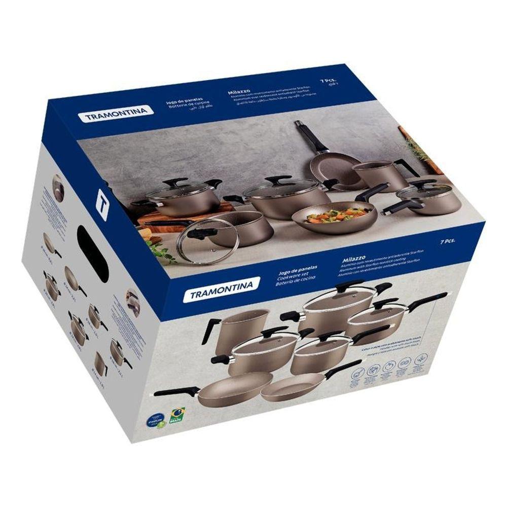 Jogo De Panelas Tramontina Milazzo Amêndoa Alumínio Com Revestimento Antiaderente Starflon Max 7 PeçasPara quem valoriza agilidade na rotina e uma cozinha mais bonita, o jogo de panelas Tramontina Milazzo amêndoa com 7 peças é uma excelente escolha. Feito em alumínio com revestimento interno e externo em antiaderente Starflon Max, garante cozimento uniforme e impede que os alimentos grudem, facilitando a limpeza. Os cabos e alças em baquelite antitérmico com toque macio oferecem no manuseio. As tampas de vidro temperado com saída de vapor e borda em aço inox ajudam a acompanhar o preparo sem abrir. com fogões a gás, elétrico e vitrocerâmico, o conjunto alia desempenho e praticidade com um visual acolhedor e moderno.Recomendações de Uso:Modo de uso: A capacidade volumétrica máxima para cozimento é de ¾ da capacidade total da peça. Em fogões com grade, centralize a peça e alinhe as alças com a grade. Centralize seu utensílio com a chama ou fonte de calor. Utensílios quentes devem estar fora do alcance das crianças. Antes do primeiro uso, lave com esponja macia, sabão neutro ou detergente líquido. Depois de secar, unte a área interna com óleo ou gordura e leve ao fogo por um ou dois minutos. Deixe esfriar e lave novamente. Seu utensílio Starflon está pronto para uso com ou sem gordura, sempre em fogo baixo ou médio (nunca superior a 260 °C). Para mexer os alimentos use somente utensílios de silicone, nylon ou madeira. Com o uso, as alças e o pegador podem afrouxar devido à dilatação normal dos materiais. Reaperte apenas o suficiente, sem forçar. Evite a imersão do utensílio quente em água fria. Nunca utilize produtos abrasivos na lavagem. Se deixar queimar alimentos, umedeça a área e reserve até que possa remover os resíduos grudados com esponja e sabão. Para maior durabilidade não utilize em máquinas de lavar. Para descarte do produto e embalagem siga as orientações de reciclagem vigentes.- Foto meramente ilustrativa.Informações Adicionais:- Para maior durabilidade não utilize em máquinas de lavar;- Tampa de vidro temperado com saída de vapor, borda de aço inox e pegador de nylon;- Alças e cabos de baquelite antitérmico com acabamento soft-touch, mais conforto no manuseio;- Revestimento interno e externo de antiaderente Starflon Max que não gruda, é fácil de limpar, mais durável e não é prejudicial à saúde, pois é livre de PFOA.