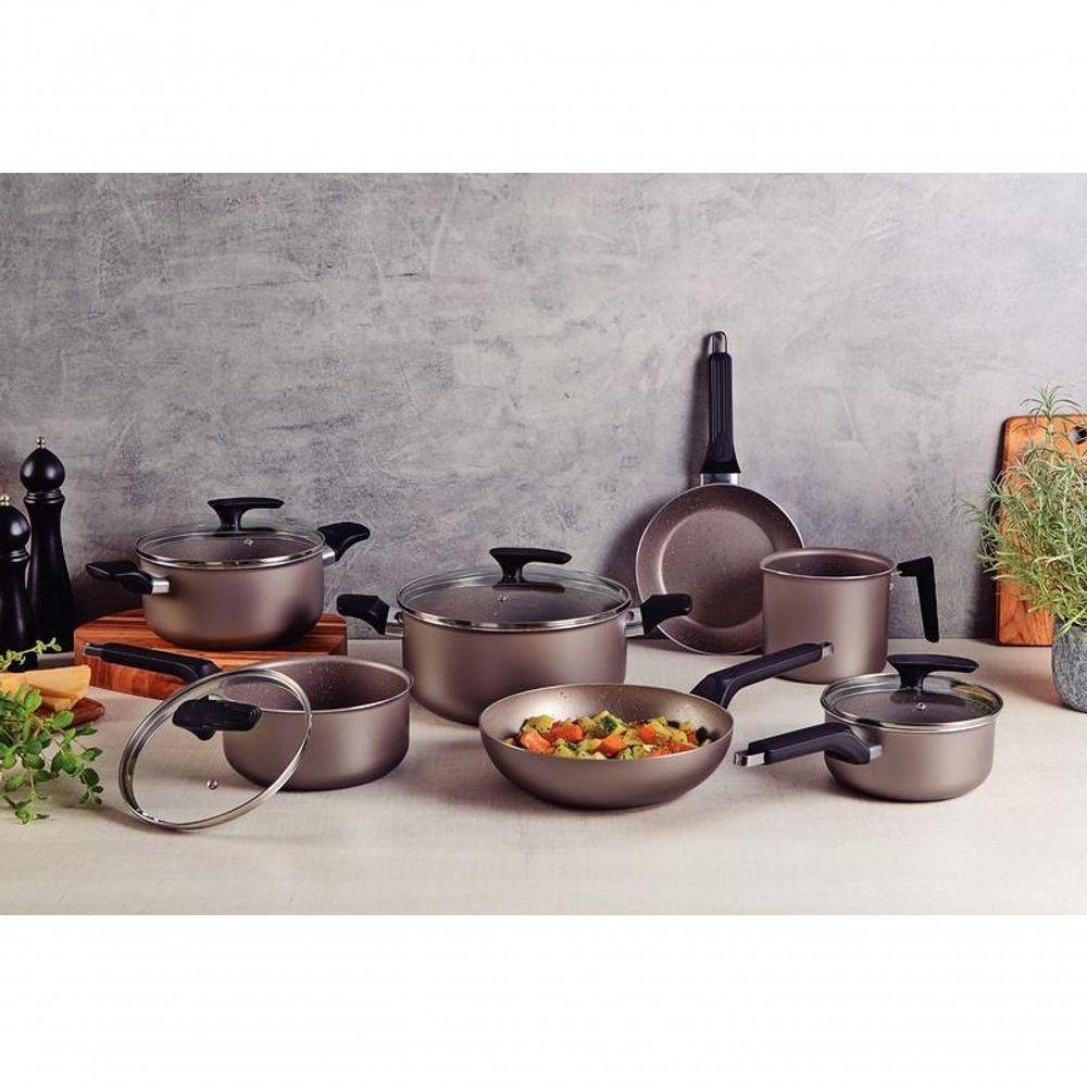 Jogo De Panelas Tramontina Milazzo Amêndoa Alumínio Com Revestimento Antiaderente Starflon Max 7 Peças
