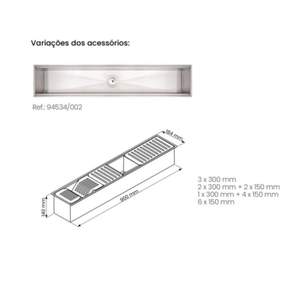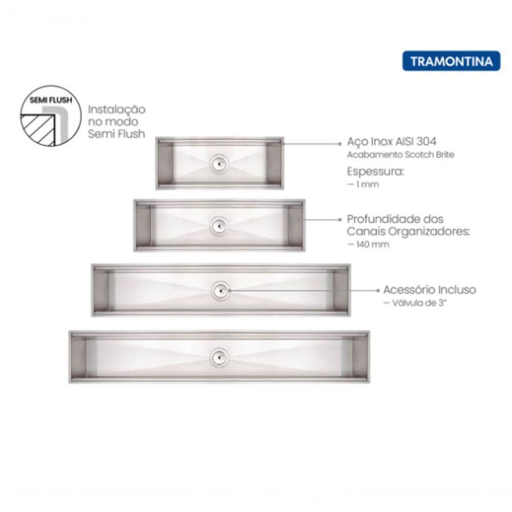Organizador Em Inox Tramontina Para Sobrepor Com Acabamento Acetinado 90x18 CmO Organizador vai completar sua cozinha ou espaço gourmet. O Organizador Tramontina para sobrepor 90x18 cm foi desenvolvido em aço inox 304 com acabamento Scotch Brite com 1 mm de espessura para sobrepor em bancadas, trazendo praticidade e sofisticação para seu projeto, um item fundamental em qualquer cozinha moderna. Devido seu tamanho de 90 cm, pode ser instalada de uma forma horizontal atrás da cuba.Utilizado para escorrer louças ou alimentos, irá coletar toda água dos escorredores auxiliares e escoará diretamente pela válvula no centro da peça, qual poderá ter a saída compartilhado com o sifão (não incluso) da cuba ou um ponto exclusivo de esgoto para o escorredor. Além de extremo requinte o Organizador é versátil e possui diferentes tamanhos e diversos acessórios opcionais como escorredor de pratos, porta talheres, escorredores rasos ou profundos de 15 ou 30 cm de comprimento (acessórios não inclusos). Um produto que pode se adequar a todas necessidades.Recomendações de Uso:Antes do Uso: Remova eventuais etiquetas e lave com detergente neutro. Usar somente esponja macia ou pano para de Uso: Montar inicialmente a válvula. Não usar ácido muriático, água sanitária ou qualquer outro solvente para lavar. Enxaguar e secar bem a peça após o uso. Nunca deixar objetos metálicos sobre a peça por períodos muito longos, para evitar a corrosão. Para manter o brilho, recomendamos o uso da pasta para polir e remover manchas em superfícies de aço inoxidável. Esta peça contém bordas cortantes, cuidado ao manusear.Informações Adicionais:- Formato: Linear;- Material: Aço Inox 304;- Profundidade 140 mm;- Peso suportado: 10 kg;- Acabamento: Scotch Brite;- Acompanha válvula de Ø 3;- Acabamento da válvula: Aço Inox e Polipropileno Econô meramente ilustrativa.