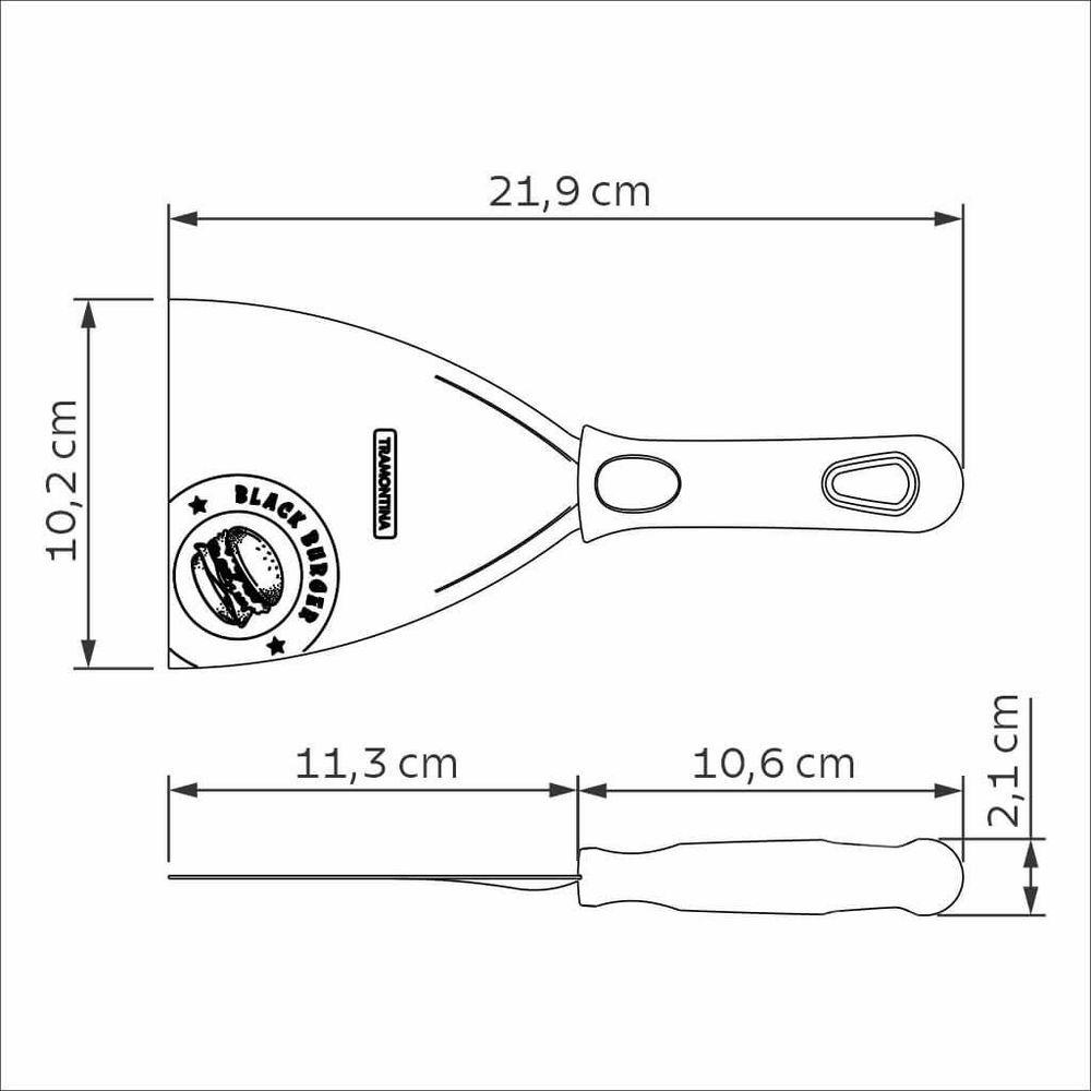 Espátula Tramontina Black Burger Com Lâmina Em Aço Inox E Cabo De Polipropileno Preto 4Colocar, virar e retirar seu hambúrguer da chapa ou churrasqueira, ficou muito mais fácil com a espátula Tramontina Black Burger com lâmina em aço inox e cabo de polipropileno preto 4 polegadas. Resistente e durável, ela é desenvolvida com lâmina em aço inox com maior espessura e uma estampagem do aço e cabo de polipropileno, características que juntas, garantem maior durabilidade, evitam deformações e a tornam mais resistentes, permitindo que seja levada à máquina de lavar louças, facilitando seu dia a dia!Recomendações de Uso:Antes do Uso: Lave bem a peça e seque-a.Modo de Uso: Produto cortante e perfurante: tenha cuidado ao manusear e mantenha fora do alcance das crianças. Para maior durabilidade do produto recomenda-se secar bem antes de guardar, mesmo após lavagem em máquina. Para descarte do produto e embalagem siga as orientações de reciclagem vigentes.- Foto meramente ilustrativa.Informações Adicionais:- Pode ir à máquina de lavar louças facilitando seu dia a dia;- Cabo de polipropileno com maior resistência e durabilidade;- Lâmina de aço inox com maior espessura e uma estampagem do aço que garante maior resistência, evitando deformações.