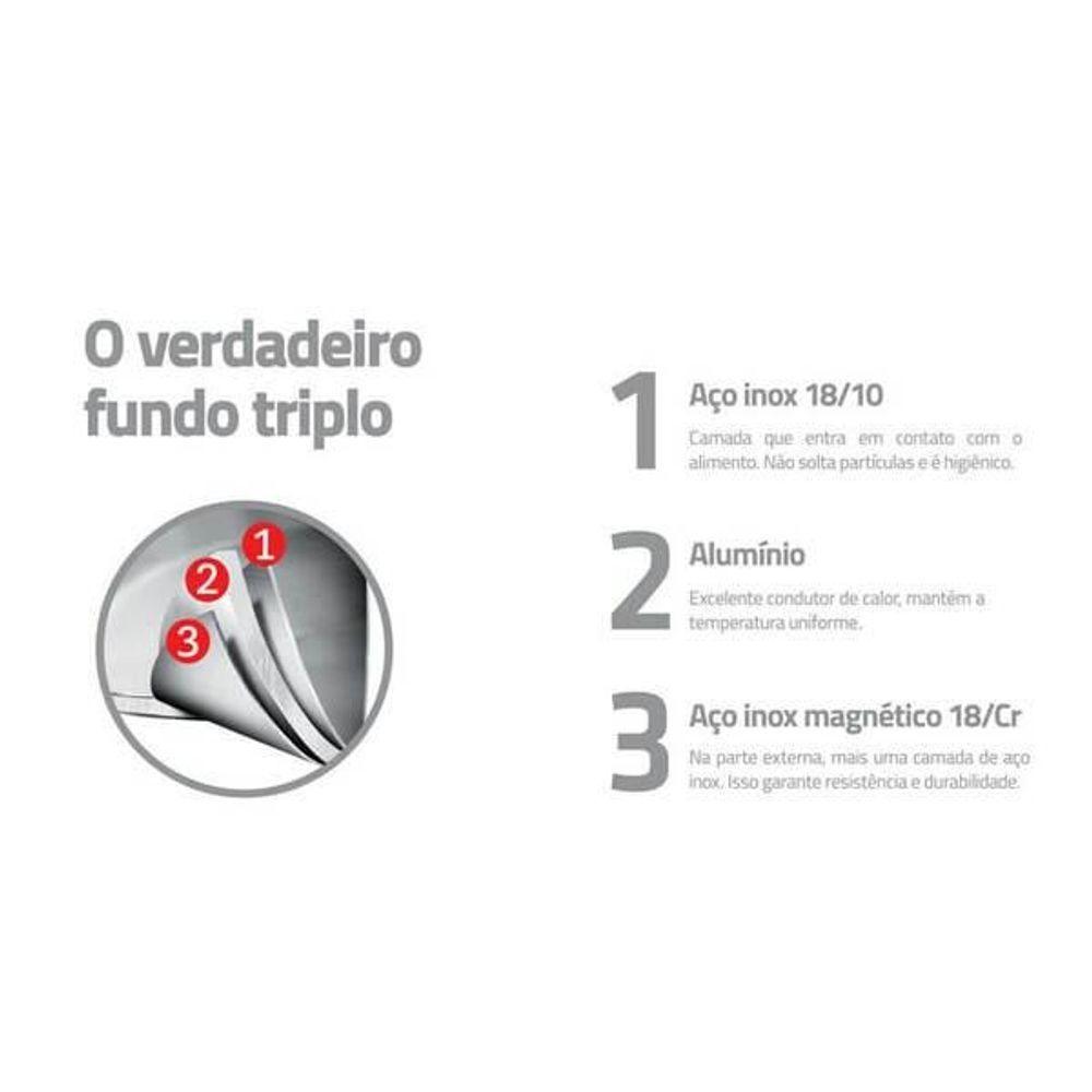 Frigideira Tramontina Allegra Aço Inox 20cm A Tramontina usa a mais alta tecnologia para produzir panelas de aço inox com fundo triplo. São duas camadas de aço inox envolvendo uma camada de alumínio. Dessa forma, o calor da chama se distribui por igual, deixando os alimentos muito mais macios e saborosos. Além disso a comida cozinha muito mais rápido, o que acaba gerando economia.Recomendações de Uso:Antes do uso: Antes de utilizar o , remova as eventuais etiquetas e lave-o com água quente e de uso: Use uma fonte de calor brando para evitar que o alimento grude no fundo da frigideira. O fundo triplo distribui uniformemente o calor, não sendo necessário o fogo alto. E, além disso, você economiza energia. Quando a frigideira for utilizada no fogão a gás, a chama não deve ultrapassar a base da frigideira. No caso de uso de chapa elétrica, a chapa deverá ter diâmetro igual ou inferior ao da frigideira. Sempre dissolva o sal em água fervendo ou com os alimentos, mexendo os ingredientes no início do cozimento. Não aqueça o alimento colocando uma frigideira do mesmo diâmetro sobre a outra. Esse procedimento é perigoso, pois cria vácuo e impossibilita a retirada do mesmo. Alguns alimentos que possuem amido, como massa e arroz, poderão deixar manchas na parte interna da frigideira durante o ós o uso: Para remover facilmente as manchas, passe um pano umedecido com suco de limão ou vinagre, Evite deixar alimento na frigideira por muito tempo o sal também pode provocar manchas. Para que a frigideira de aço inox fique sempre bonita e com brilho, recomendamos que seja lavada somente com detergente e esponja. A Tramontina desenvolveu uma pasta especial para polir e remover manchas nos produtos de aço inoxidável, que está disponível nos principais pontos de venda. (94537000)Depois da lavagem, sempre que possível, enxágue a frigideira com água quente e seque-a imediatamente, para que ela mantenha o brilho , pois o cloro e as substâncias contidas na água podem deixar manchas na frigideira. Não deixe a frigideira vazia sobre uma fonte de calor. Deixe a frigideira quente somente em superfícies resistentes ao calor. Os cabos de inox aquecem durante o cozimento, por isso use luvas durante o manuseio.- Foto meramente ilustrativa- Embalagem litografadaInformações Adicionais:- Totalmente feita em aço inox, por isso não solta nenhum resíduo nos alimentos, mantendo-os saudáveis. - Altamente durável, mantém as características , preservando a beleza, a higiene e a durabilidade do material. - O fundo triplo (aço inox + alumínio + aço inox) distribui o calor uniformemente, proporcionando um cozimento mais rápido e uniforme, economizando energia e deixando os alimentos aquecidos por mais tempo. - Possui design diferenciado e moderno, com acabamento em alto brilho. - Desenho limpo e sem cantos torna a limpeza mais fácil. - Pode ser lavada diariamente na máquina de lavar louças.- Pode ser utilizada nos fogões: elétrico, gás, indução e vitrocerâmico.