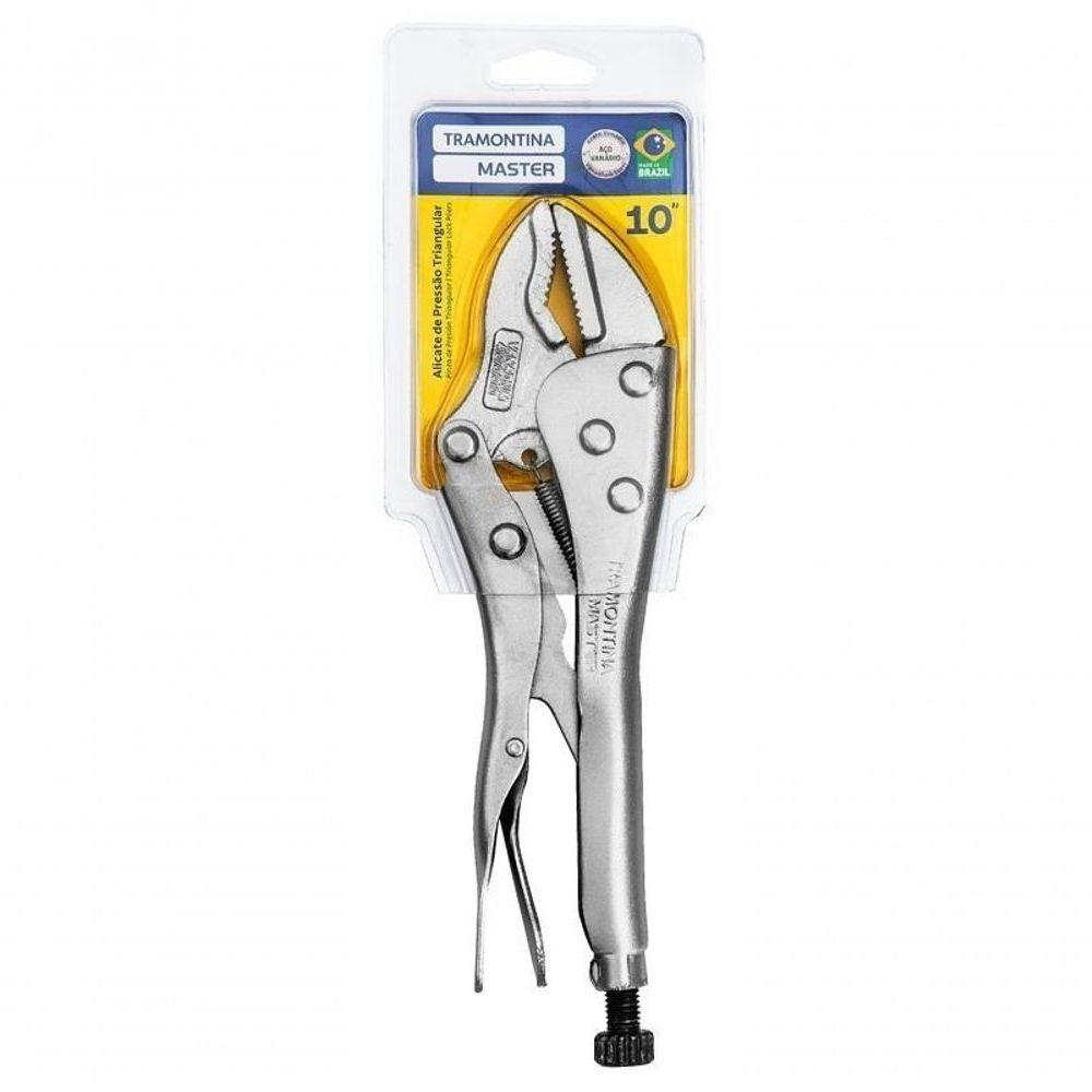 Alicate De Pressão Tramontina Master 10" Com Mordente TriangularO Alicate de Pressão 10 Polegadas Tramontina Master com Mordente Triangular é a solução ideal para quem busca firmeza e durante o trabalho. Indispensável em tarefas como corte, solda, lixamento e outras que exigem a fixação do objeto, ele conta com sistema de trava automática que mantém a peça presa com estabilidade. Fabricado em aço vanádio temperado, garante alta resistência e durabilidade. Seu mordente com perfil triangular oferece melhor encaixe e aderência, tornando o manuseio mais eficiente. Uma ferramenta robusta, e pronta para facilitar o seu dia a dia.Recomendações de Uso:Modo de uso: Use óculos, luvas e outros equipamentos de proteção de acordo com a tarefa a ser executada. Observe as indicações de uso de cada tipo de alicate ou torquês. Nunca utilize um alicate ou torquês para cortar arames endurecidos, a não ser que tenha sido projetado para este fim. Nunca utilize o alicate ou torquês como martelo. Ele pode trincar ou até mesmo quebrar. Nunca exponha os alicates ou torqueses ao calor excessivo. Isto pode alterar o tratamento térmico aplicado no corte e afetar o seu desempenho. Sempre posicione o corte do alicate ou torquês perpendicularmente ao eixo do arame para uma operação mais rápida e segura. Utilize alicates isolados, identificados pela marcação V no cabo, quando for necessário trabalhar em locais com corrente elétrica. Importante: nestes casos, inspecione a integridade da isolação elétrica, e, se aparecerem trincas na isolação, suspenda o uso imediatamente. Nunca aumente o comprimento dos cabos dos alicates ou torqueses. Isto amplifica a força exercida sobre a cabeça da ferramenta podendo quebrá-la. Nunca utilize o alicate ou torquês em porcas e parafusos. Para estes trabalhos, indica-se o uso de chaves de aperto. Lubrifique periodicamente a articulação. Isto aumenta a vida útil do produto e melhora sua performance. Armazene em limpo e seco.- Foto meramente ilustrativa.Informações Adicionais:- Abertura regulável;- Acabamento cromado;- Mordentes com perfil triangular;- Possui alavanca para destravar;- Corpo formado por chapas conformadas;- Formato ergonômico para maior conforto;- Mordentes forjados em aço vanádio e temperados;- As ferramentas são produzidas e testadas conforme normas específicas;- Sistema de rebites especialmente projetado para aumentar a resistência do produto;- O aço carbono especial empregado na fabricação dos mordentes, aliado à têmpera garantem maior resistência.