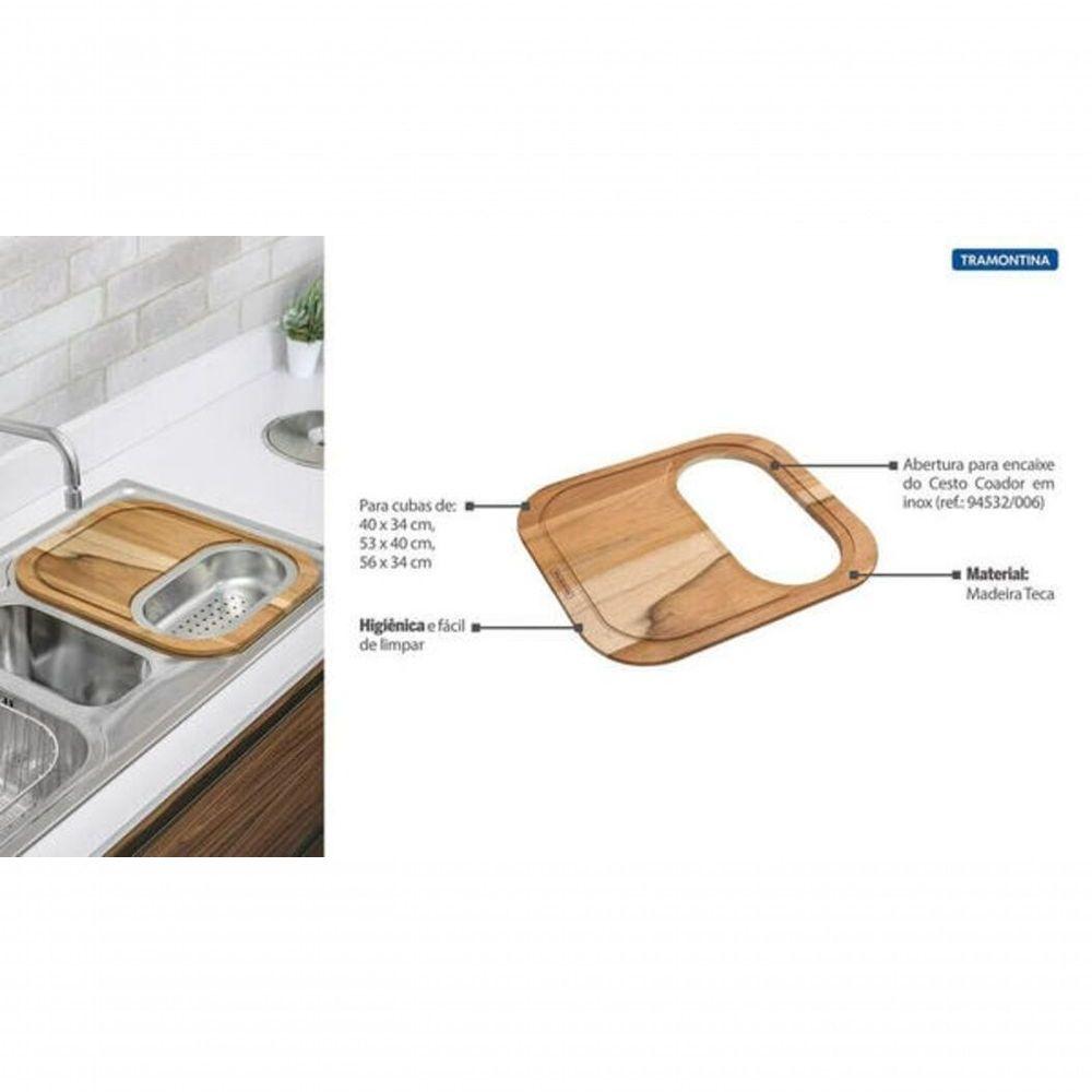 Tábua Para Cubas E Pias De Cozinha Tramontina Em Madeira 42 X 36cmA Tábua para Cubas e Pias de Cozinha Tramontina em Madeira, torna o dia a dia na cozinha mais prático e moderno. Produzida em madeira teca, possui tamanho de 42x36 cm. Indicada para cortar os alimentos, encaixa-se perfeitamente na cuba. Você pode adicionar um cesto coador para facilitar ainda mais as atividades na sua bancada.Recomendações de Uso:Antes do Uso: Lave com água quente, sabão e enxugue-a bem. Quando estiver seca, passe um pouco de óleo de cozinha sobre toda a superfície, retirando bem o de Uso: Após cada uso, lave o produto sempre com água e sabão neutro, secando-o com toalha de necessidade de limpeza (lavar, secar e armazenar corretamente) contribui para que a tábua mantenha suas características saudáveis e naturais.Utilizar o molde que acompanha a cuba para efetuar o corte no granito, para que a prancha se encaixe perfeitamente.Informações Adicionais:- Madeira Teca;- Possui para cesto coador;- Possui proteção antibacteriana (Microban);- Indicado para cubas com 40 x 34, 53 x 40 e 56 x 34 cm;- Não a deixe submersa em água nem armazenada sobre a pia;- Não lave o produto em lava-louça e não utilize esponja de aço.- Foto meramente ilustrativa.